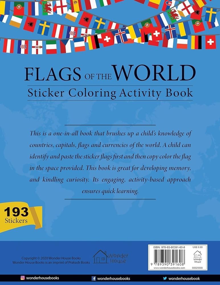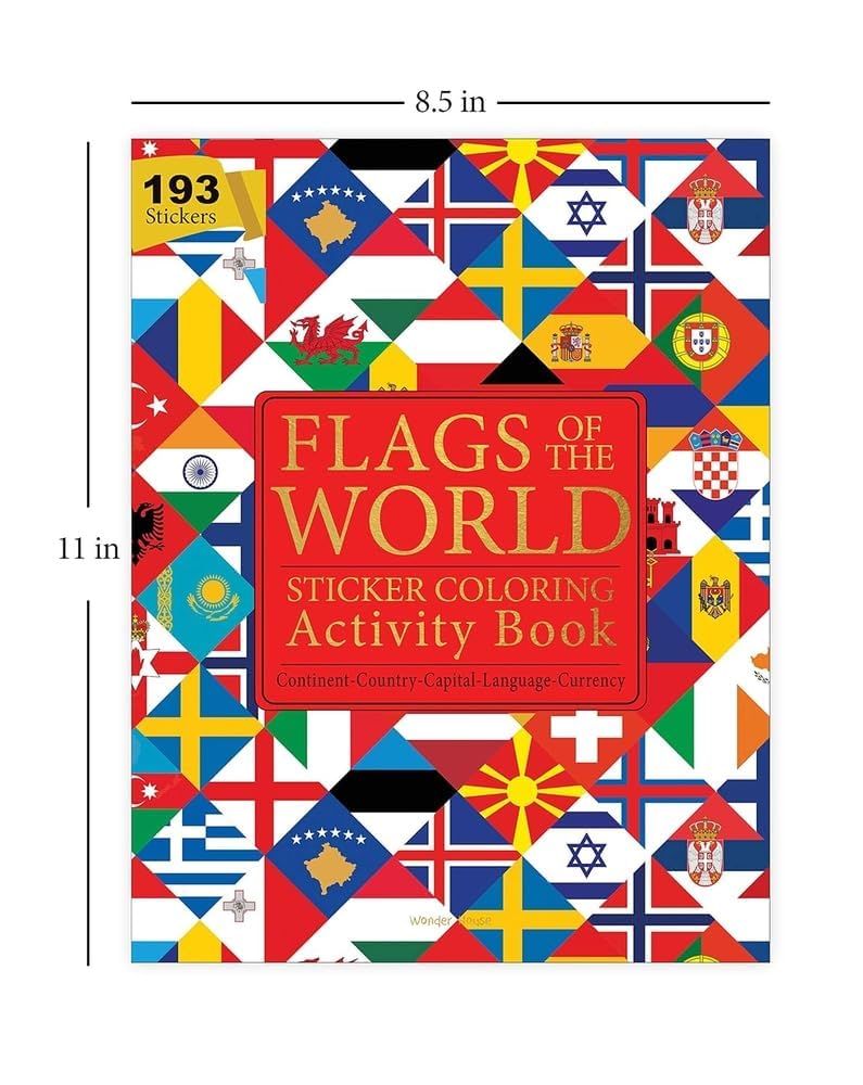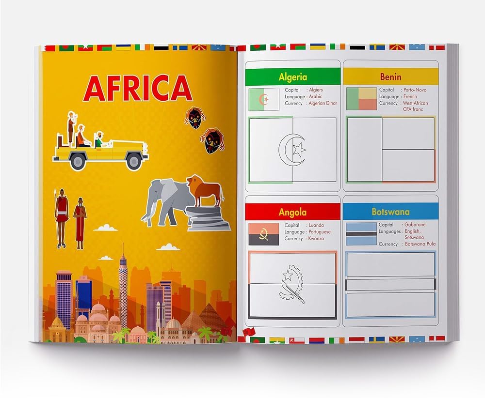Flags of the World – Sticker Coloring Activity Book For Children : Continent, Country, Capital, Language and Currency