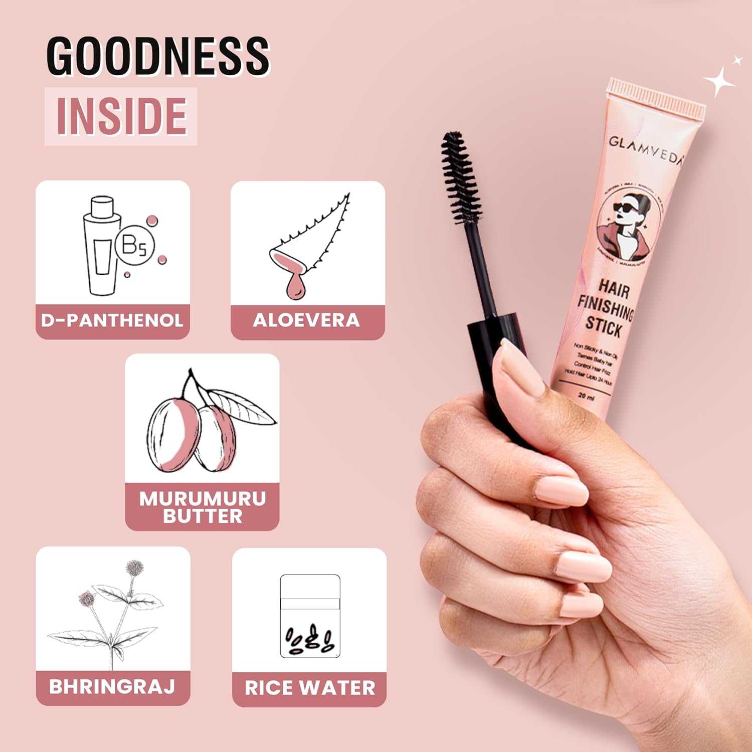 GLAMVEDA Frizz Free Hair Finishing Stick | Anti Frizz Hair Fix Gel Stick | Non-Greasy & Non-Sticky | Anti Flyaways & Baby Hair Fixer | 24 Hours Stay | With Rice Water | 20ml Pack Of 1