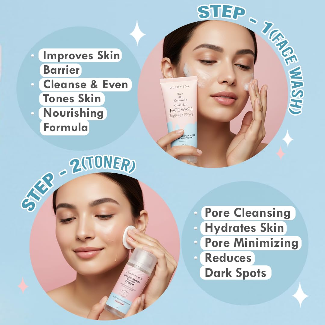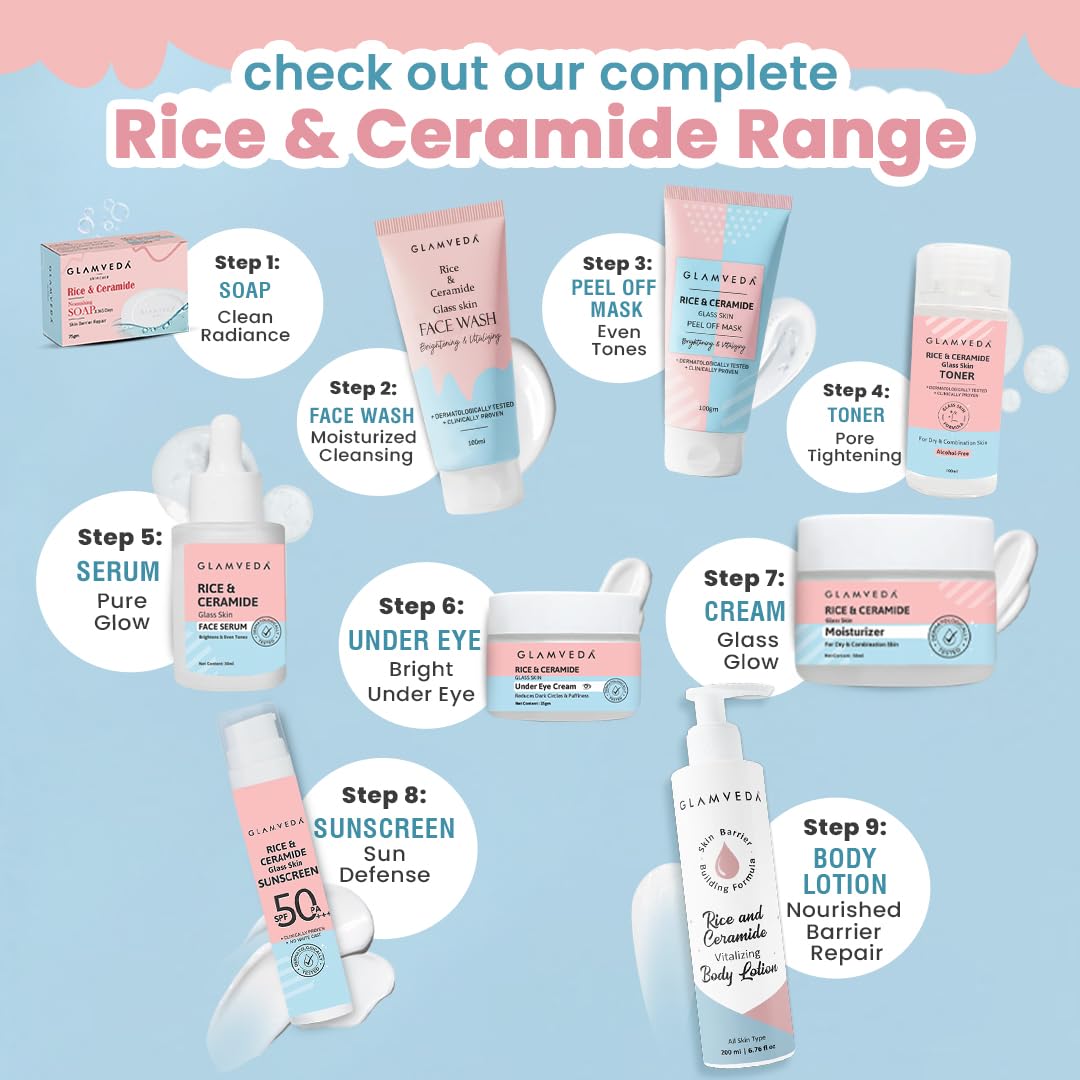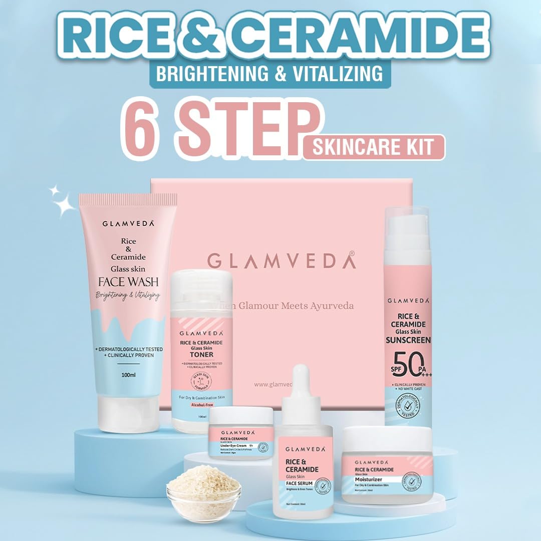 Glamveda Korean Rice Ceramide 6 Step Skincare Kit for Glowing Skin | Face Wash, Face Serum, Moisturizer Cream, Toner, Sunscreen SPF 50 PA+++, Under Eye Cream | Skincare Gift Set for Woman