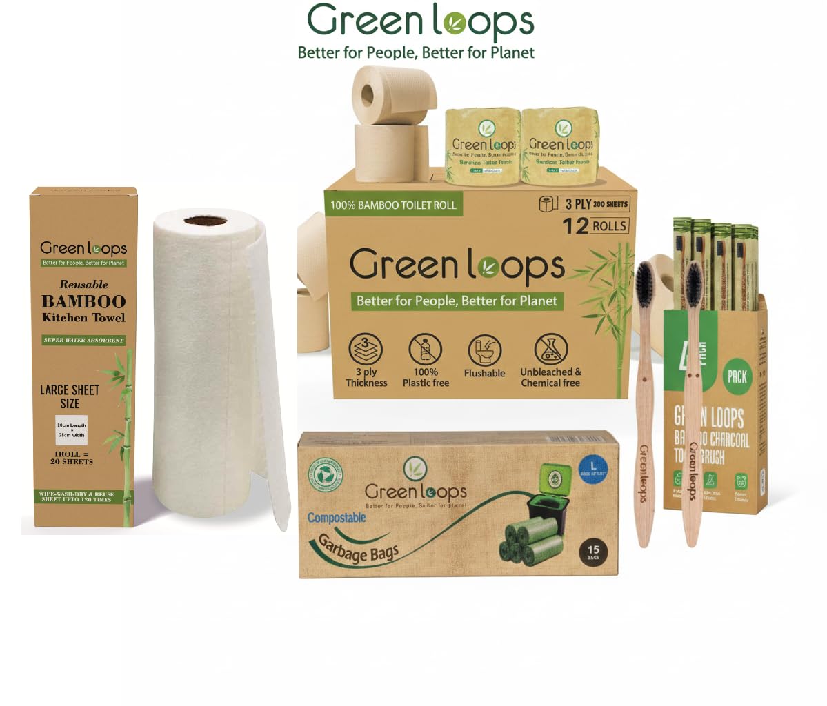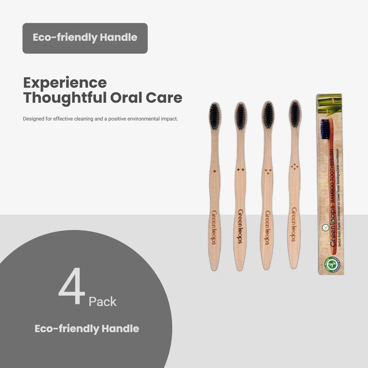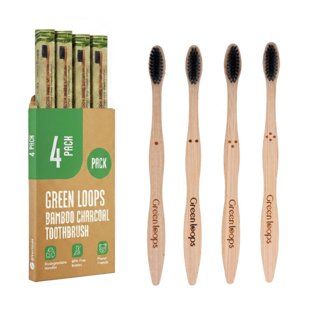 Green Loops Bamboo Toothbrush Pack of 4 | Charcoal Infused Soft Bristles | Eco-Friendly & Antibacterial | Wooden Handle | Biodegradable & Plastic-Free Oral Care for Adults & Kids