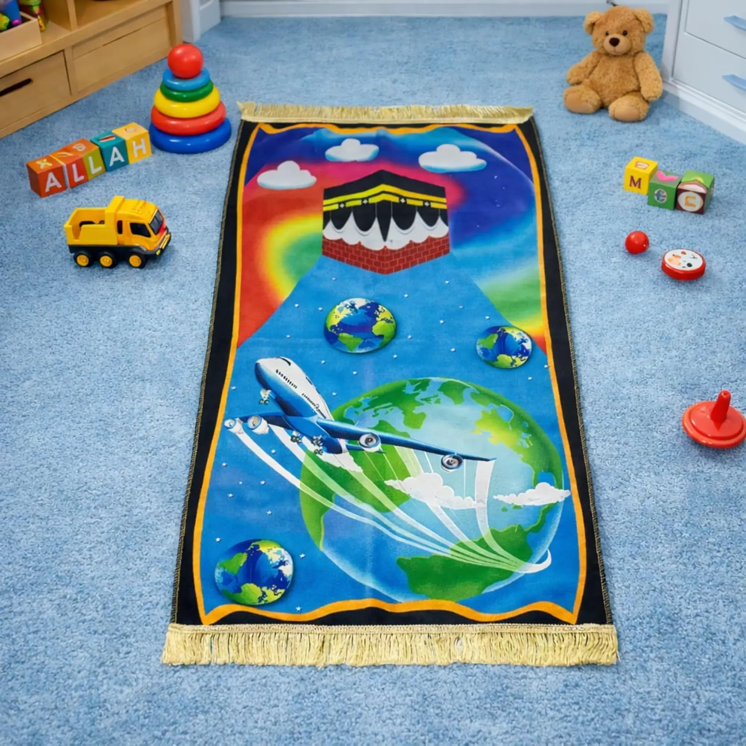 HADIYAH Rectangle Rainbow Salah Joy Kids Design Premium Janamaz | Prayer Mat with Name Customisation Option | Soft Velvet Prayer Rug