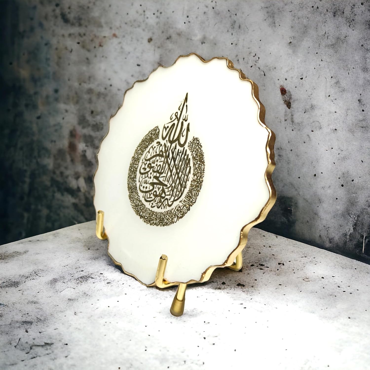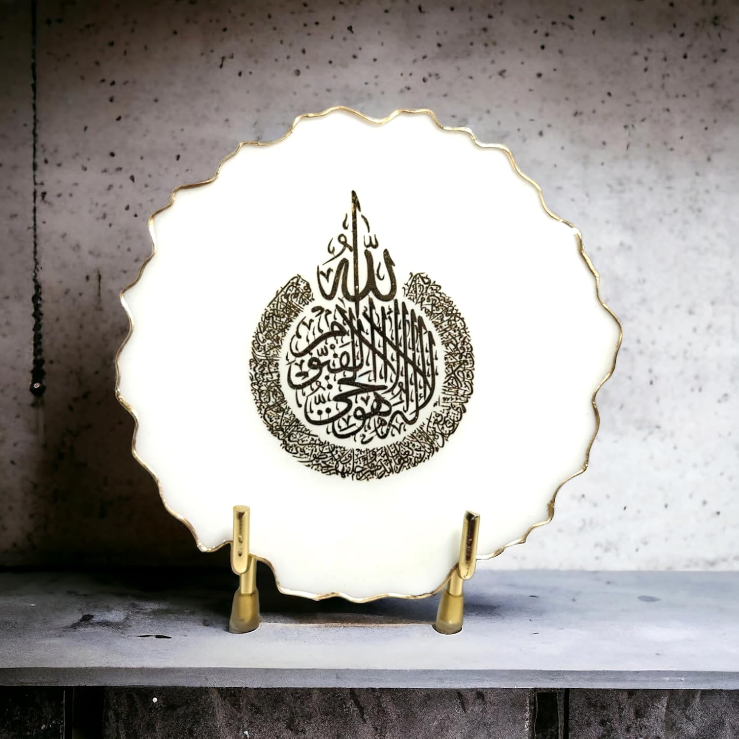 Add a touch of elegance and spirituality to your living space with our Ayatul Kursi Islamic Calligraphy Resin Dashboard. This stunning piece features the revered Ayatul Kursi beautifully inscribed in Arabic calligraphy, enhanced with luxurious gold metal sticker detailing. Made from high-quality resin, this dashboard is not only a symbol of faith but also a work of art that will elevate the aesthetic of any room. Whether placed on a mantel, shelf, or table, this decorative dashboard is designed to be a versatile addition to your home decor. Its intricate design and elegant finish make it a perfect focal point in your living room, bedroom, or office. The dashboard comes with a stable metal stand, ensuring it remains securely displayed wherever you choose to place it. This exquisite dashboard also makes a thoughtful and cherished gift for your loved ones. Ideal for special occasions such as Eid, Ramadan, weddings, and housewarmings, it is a meaningful present that will be treasured for years to come. Each dashboard is meticulously handcrafted, ensuring that every piece is unique. Embrace the beauty of Islamic art and culture with this exceptional decorative dashboard, and let it inspire and uplift your space.