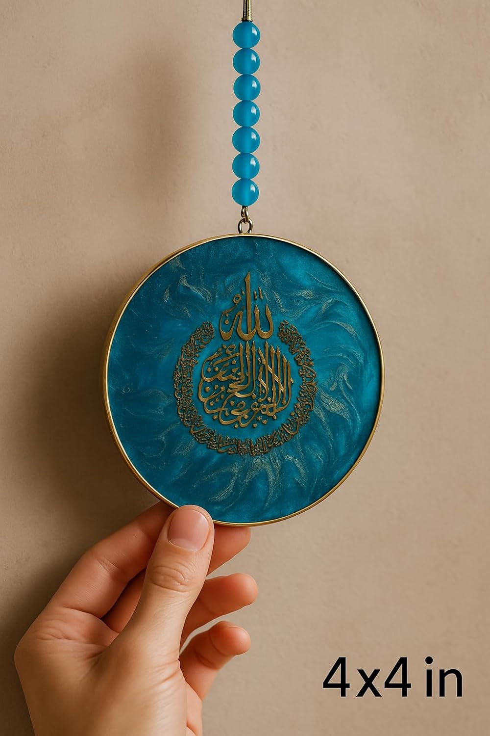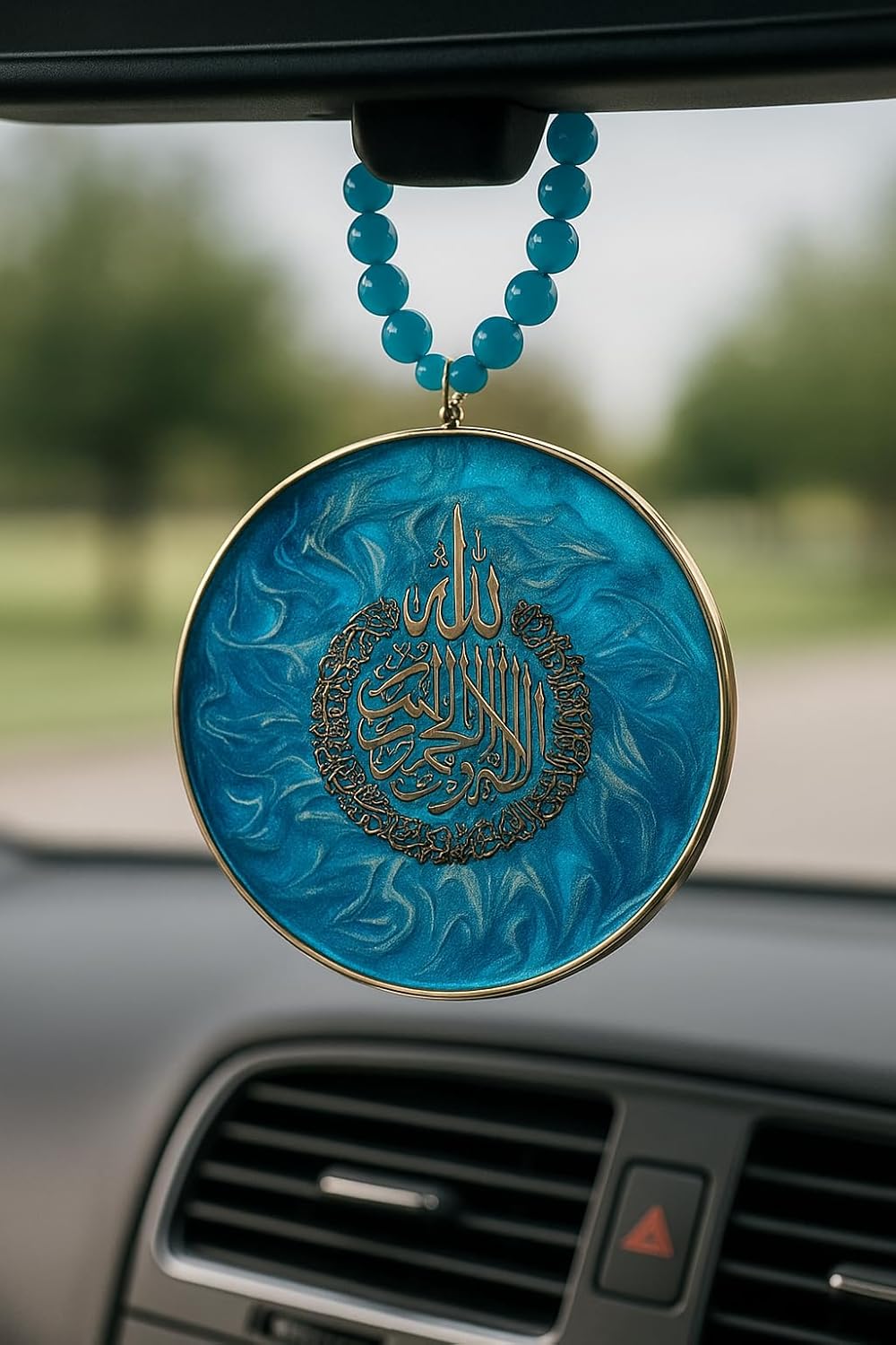 Handmade Car hanging/Wall Art Hanging Decor, Turquoise Blue Resin Medallion with Arabic Calligraphy, Gold Frame with Beaded Chain
