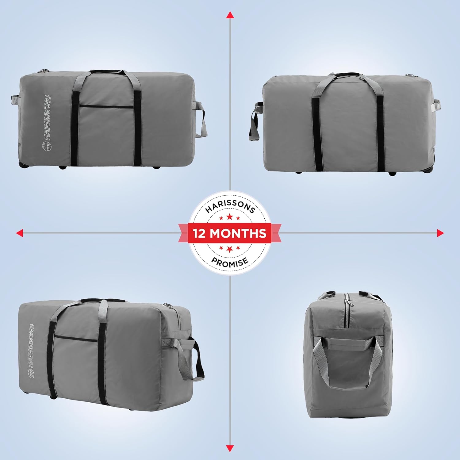 Harissons Holdall Wheeled Duffel Bag | 97L | Foldable & Spacious Travel Luggage with Smooth Wheels, Lockable Pullers & Quick-Grab Handles (Grey)