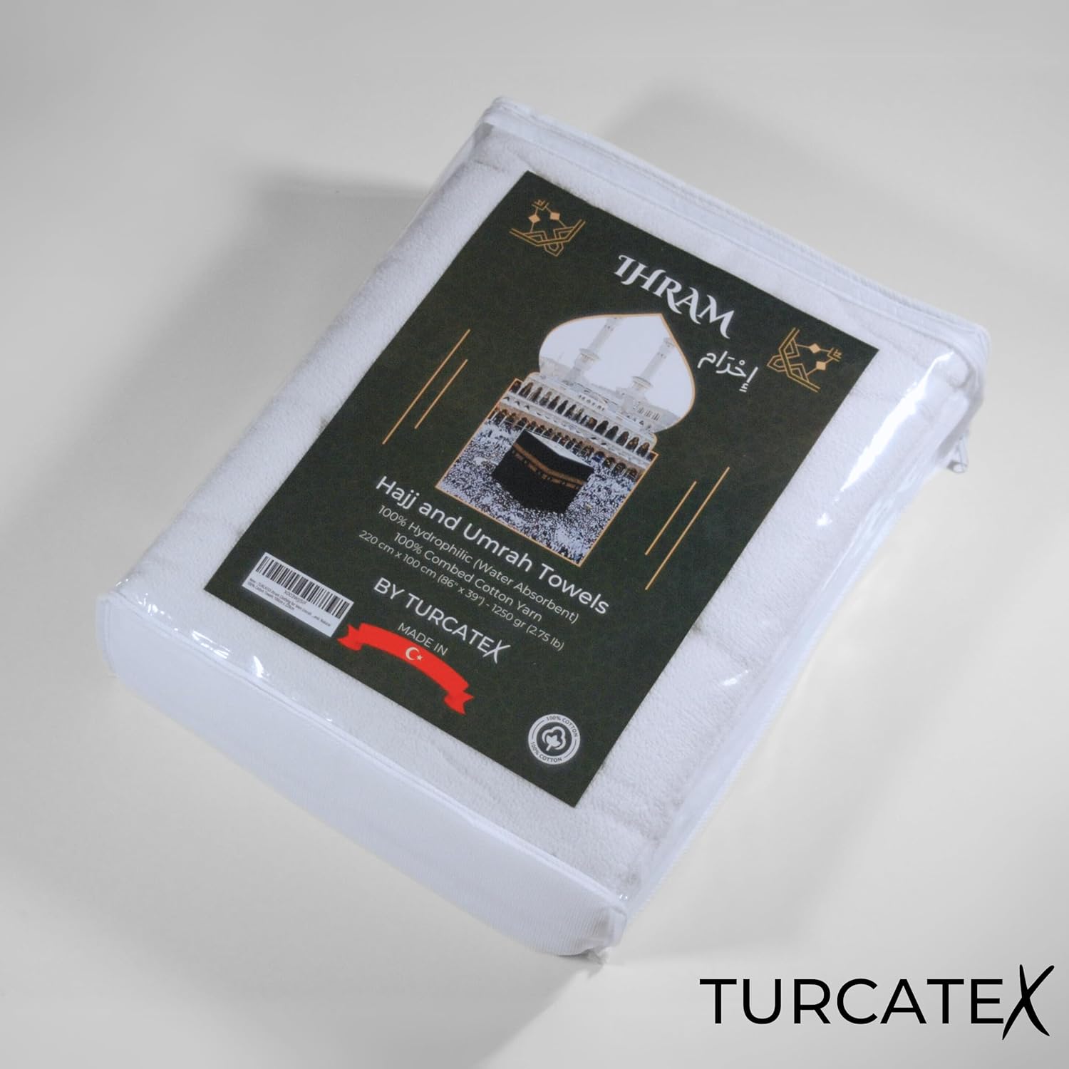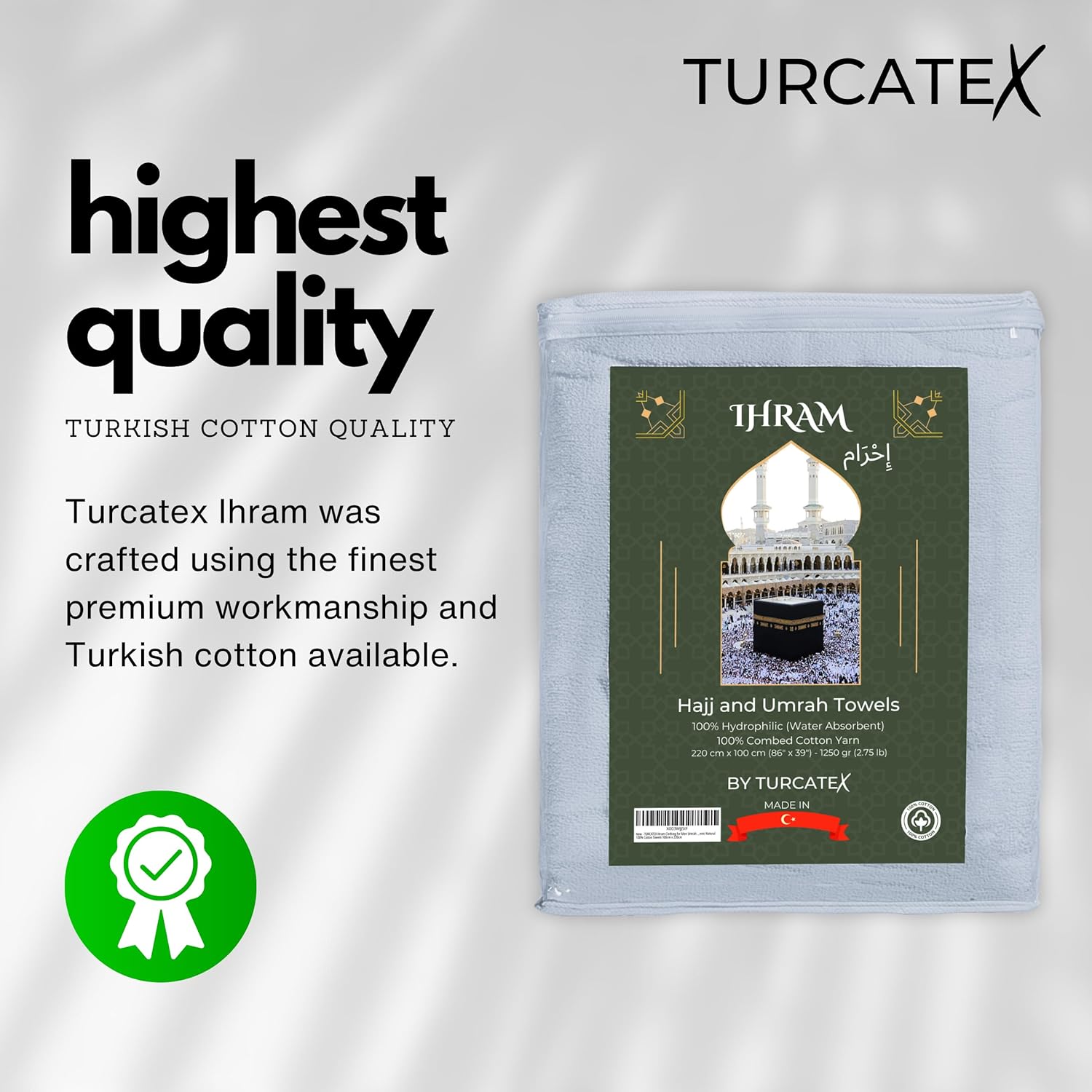 [TURKISH-QUALITY] Experience the luxury of 100% Turkish-quality combed cotton yarn with the TURCATEX IHRAM, a lightweight and hygienic ihram set perfect for your spiritual odyssey.