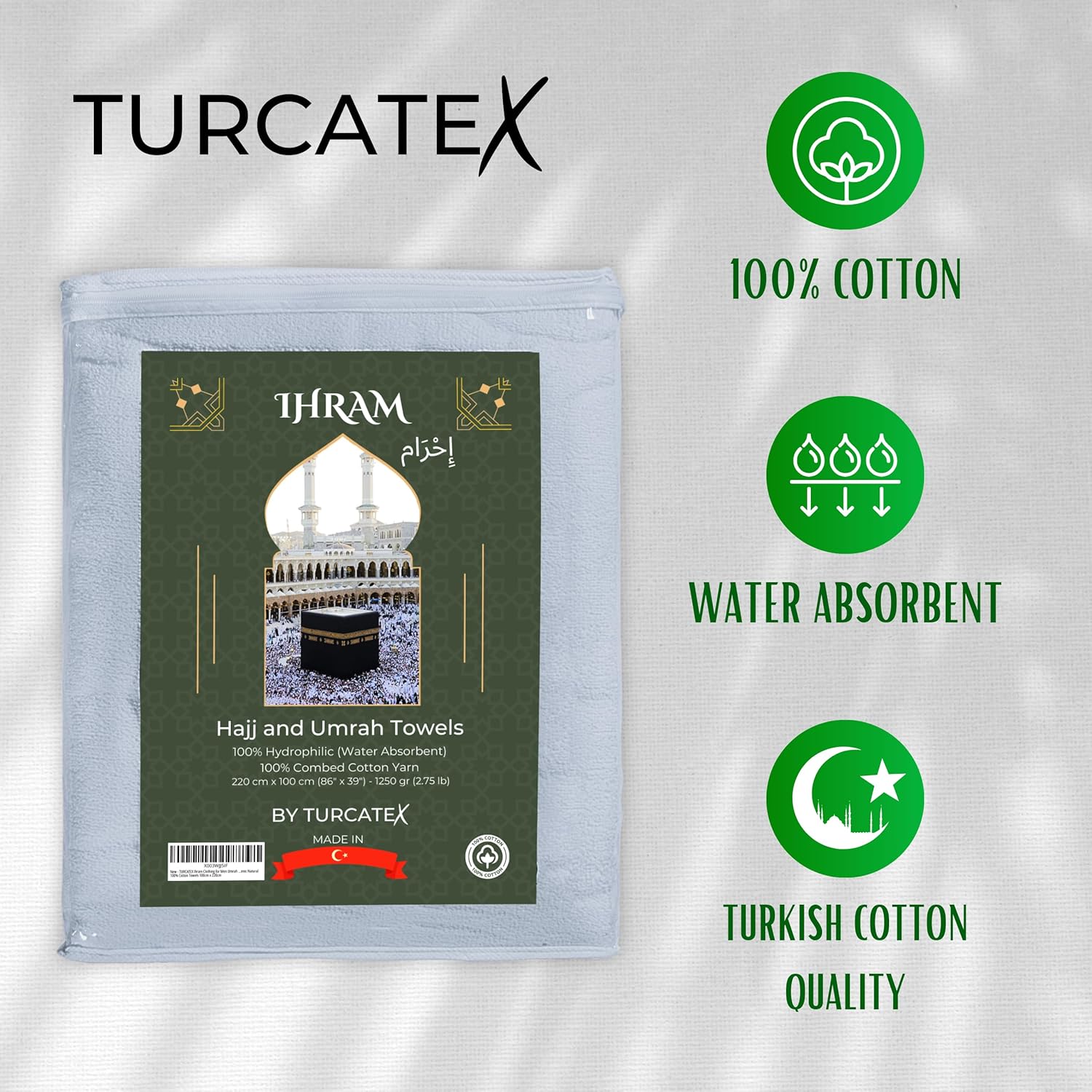 [PREMIUM COMFORT] Elevate your pilgrimage experience with the TURCATEX IHRAM, a premium 100% cotton ihram designed for unparalleled comfort during Hajj and Umrah visits.