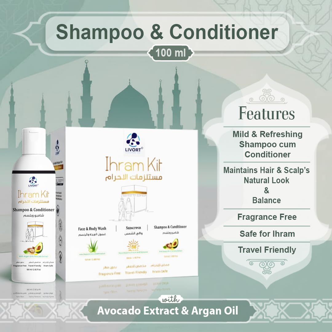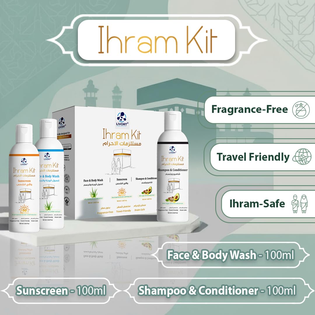 Generic Name : LIVORT Ihram Kit for Hajj & Umrah | Face & Body Wash, Sunscreen, Shampoo & Conditioner | Gift Set for Hajj and Umrah | Pack of 3 x 100 ml