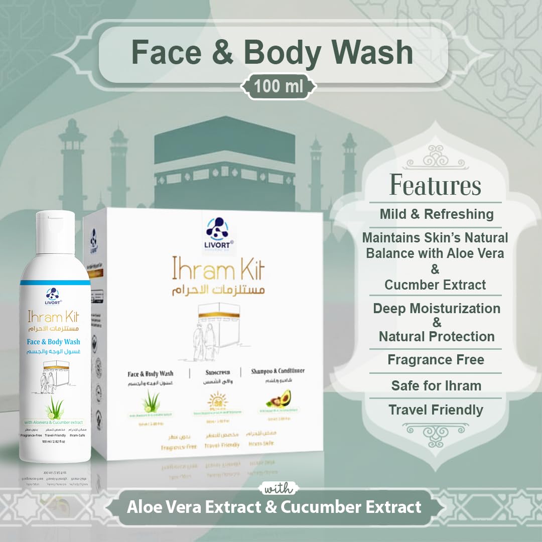 LIVORT® Ihram Kit Face & Body Wash, Sunscreen, Shampoo & Conditioner is meticulously formulated to meet specific needs of Hajj and Umrah pilgrims, providing a fragrance-free solution for bathing and facial cleansing during Ihram.