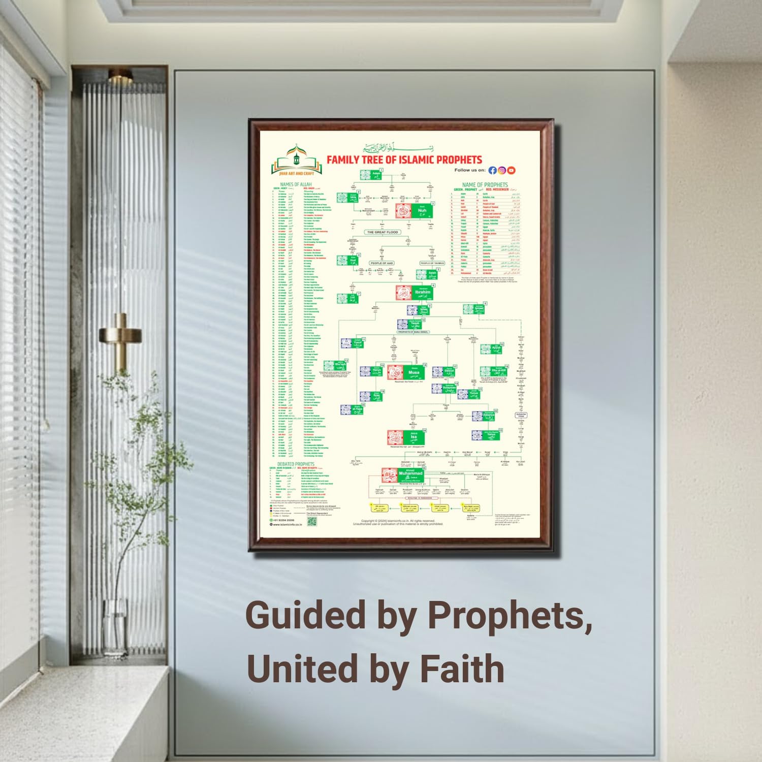 Enhance your space with this beautifully designed Islamic wall art featuring a detailed family tree of Islamic prophets along with the 99 names of Allah. Thoughtfully structured for clarity and learning, this elegant piece blends spirituality with knowledge, making it perfect for homes, offices, or prayer areas. A meaningful décor item that inspires faith, reflection, and understanding for all ages.