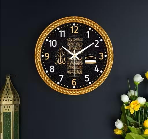 This elegant Islamic wall clock combines functionality with spiritual beauty, making it a perfect addition to any Muslim home or office. The striking black face features exquisite Arabic calligraphy and sacred Islamic imagery, including the word ‘Allah’ and a depiction of the Holy , creating a meaningful focal point that reminds you of your faith throughout the day. The clock is framed by an ornate gold rope-style border that adds a touch of luxury and traditional craftsmanship to the design. With clear white numerals and hands, this timepiece ensures easy readability from across the room whilst maintaining its decorative appeal. Measuring 10 centimetres in diameter, this compact clock is versatile enough to grace various spaces, from living rooms and bedrooms to prayer rooms and offices. The sophisticated gold and black colour scheme complements both modern and traditional interior décor styles, making it a thoughtful gift for religious occasions, housewarmings, or festivals. This Islamic wall clock serves not only as a practical timekeeping device but also as a beautiful piece of Islamic art that celebrates your faith and enhances your home’s spiritual atmosphere.