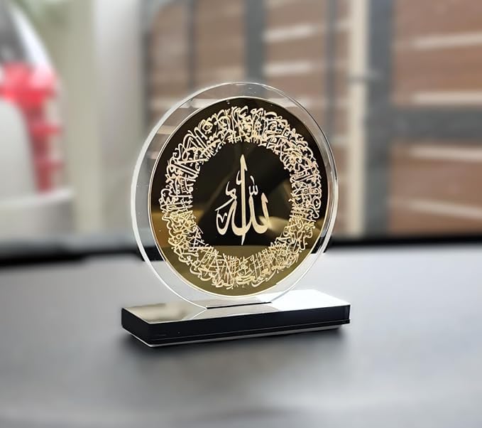 This exquisite Islamic decorative plaque features the sacred name of Allah in elegant calligraphy, beautifully surrounded by the verses of Ayatul Kursi in an intricate circular design. Crafted from premium clear acrylic material with detailed engraving, this round plaque showcases a sophisticated black and gold colour scheme that adds a touch of reverence and elegance to any space. The integrated LED lighting system illuminates the calligraphy from within, creating a mesmerising visual effect that highlights the sacred text and transforms it into a captivating focal point. Mounted on a sleek black base stand, this 15-centimetre decorative piece offers stable display on desks, shelves, mantels, or side tables. The compact design makes it versatile for placement in living rooms, bedrooms, prayer rooms, or offices. Weighing just 0.3 kilograms, it combines traditional Islamic artistry with contemporary design aesthetics. The package includes the acrylic plaque with LED light, black base stand, USB power cable, and user manual. This spiritually significant piece serves as a constant reminder of faith and makes a thoughtful gift for religious occasions, housewarmings, weddings, or Ramadan celebrations.