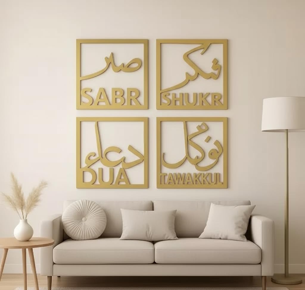 Islamic Wooden Wall Art Set, Gold Arabic Calligraphy Frames with Sabr Shukr Dua Tawakkul, Modern Home Decor, Square Wooden Wall Art
