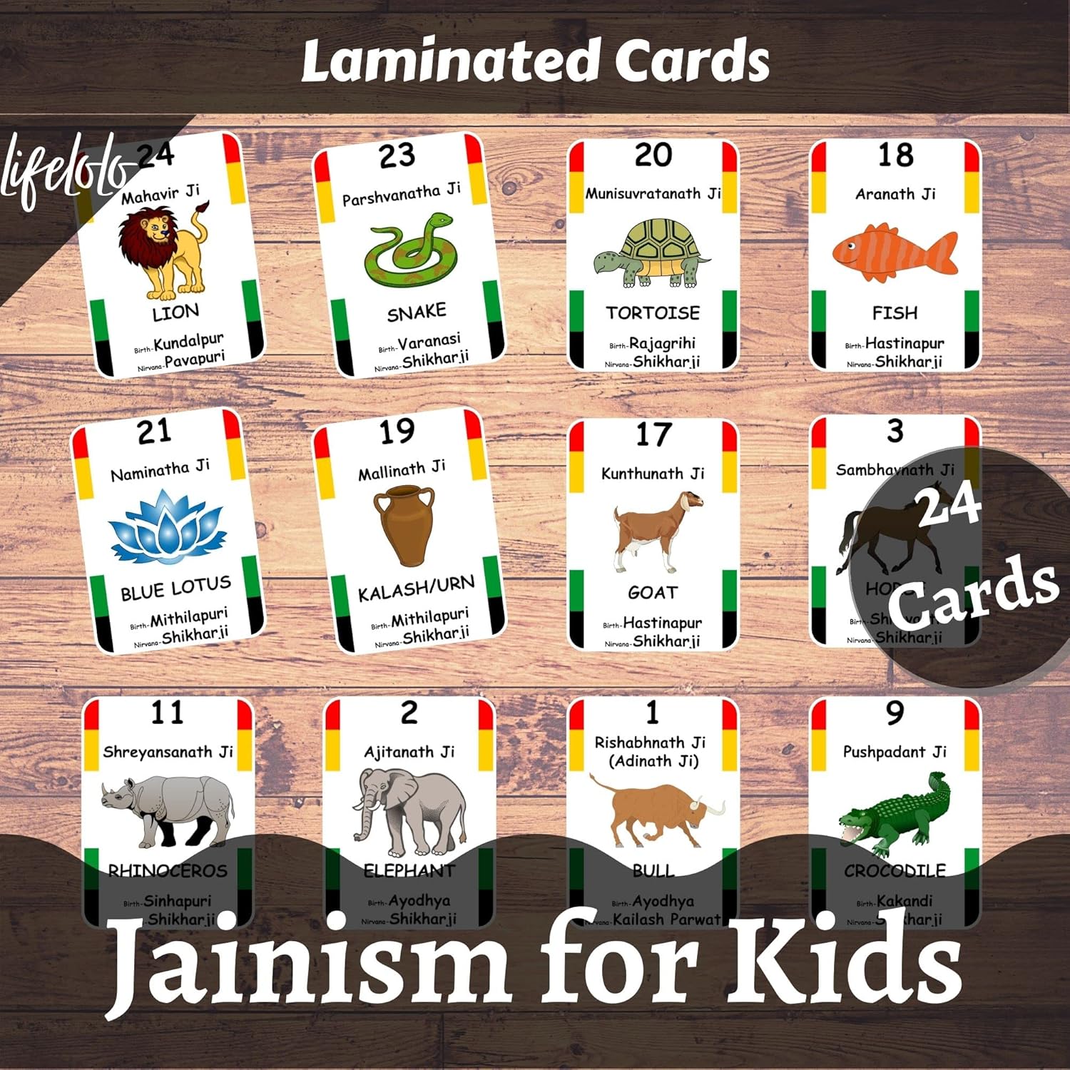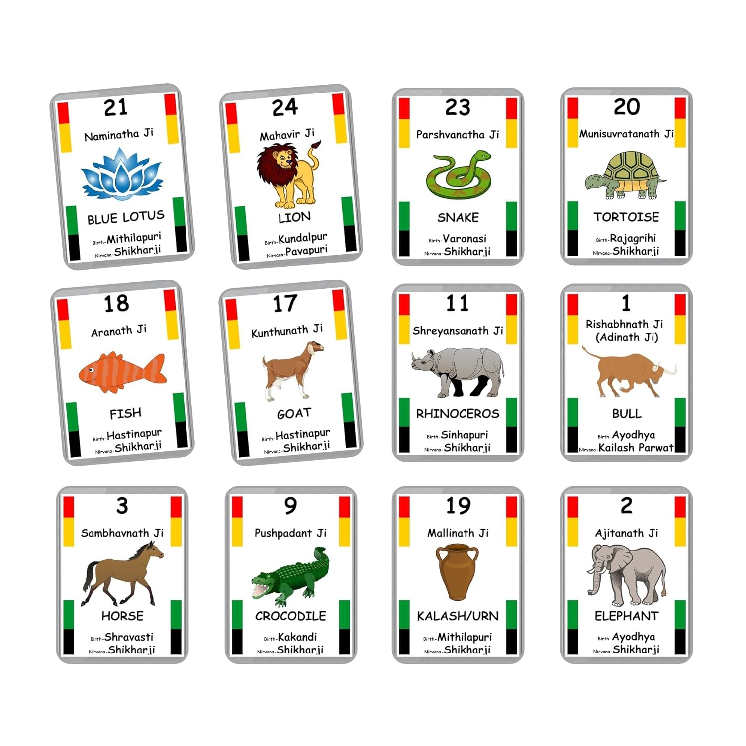 Jainism for Kids Flash Cards | Homeschooling | Laminated Flash Cards | Early Education – 24 Jain Teerthankras, Symbols, Birthplace (Swetambar)