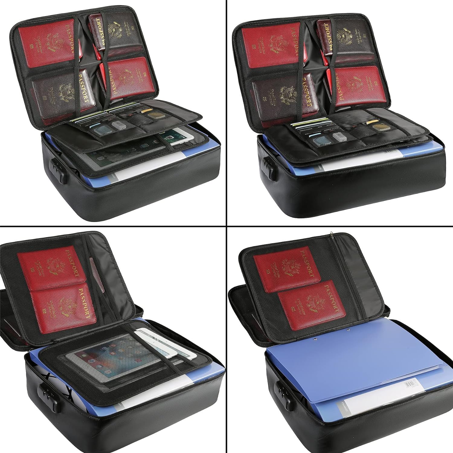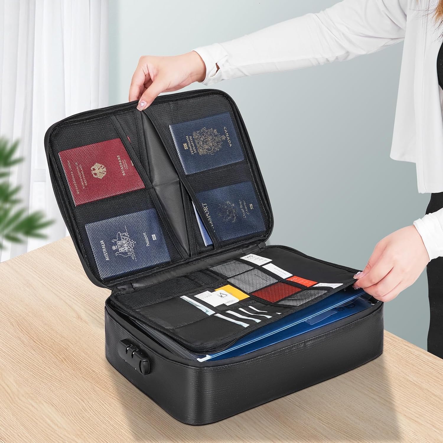 Our fireproof safes, measuring 15.5 x 11.5 x 5.5 inches, are designed with a 4-tier layout to impeccably organize your documents. This fireproof safe for home documents includes 8 mesh passport pockets, 10 card slots, 4 U Disk compartments, 5 folder layers, and a roomy main pocket. Our fire-safe document box provides a secure and orderly storage solution for your crucial documents, files, cash, passports, U-desks, and card certificates.