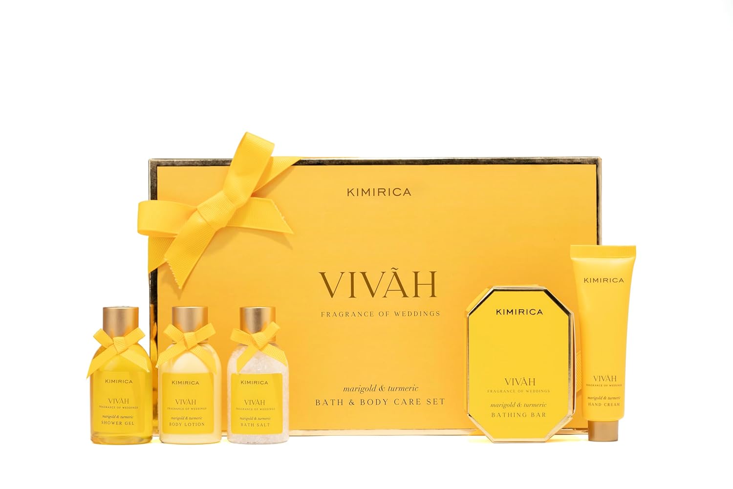 Kimirica Vivah Experience Wedding gift set for couple| Uniquely Crafted Wedding Gifts contains Body wash, Body Lotion, Bath Salt, Bathing bar and Hand cream | Luxuriously Scented Marigold & Turmeric | perfect Gifts for Wedding | 5 Piece Gift Hamper