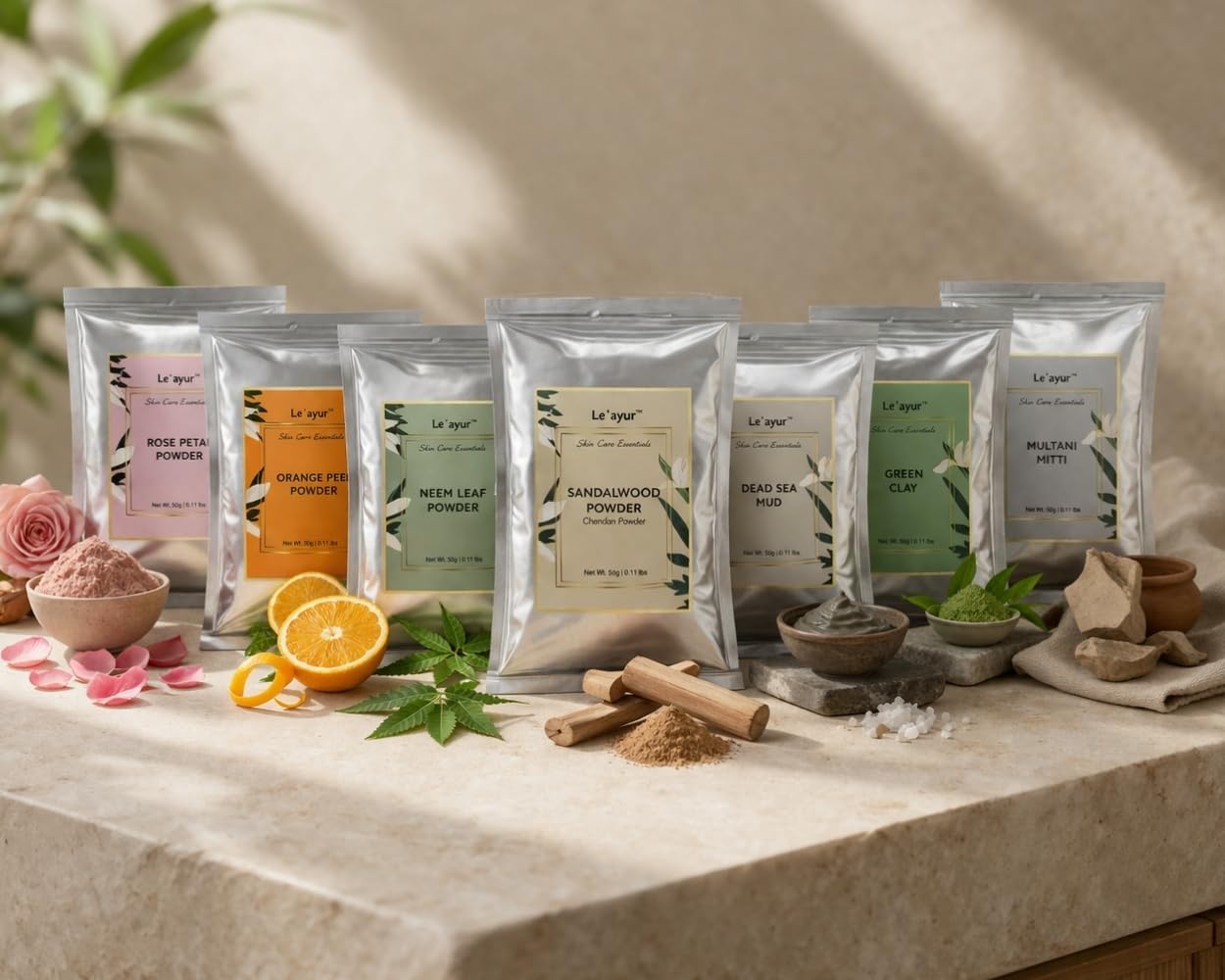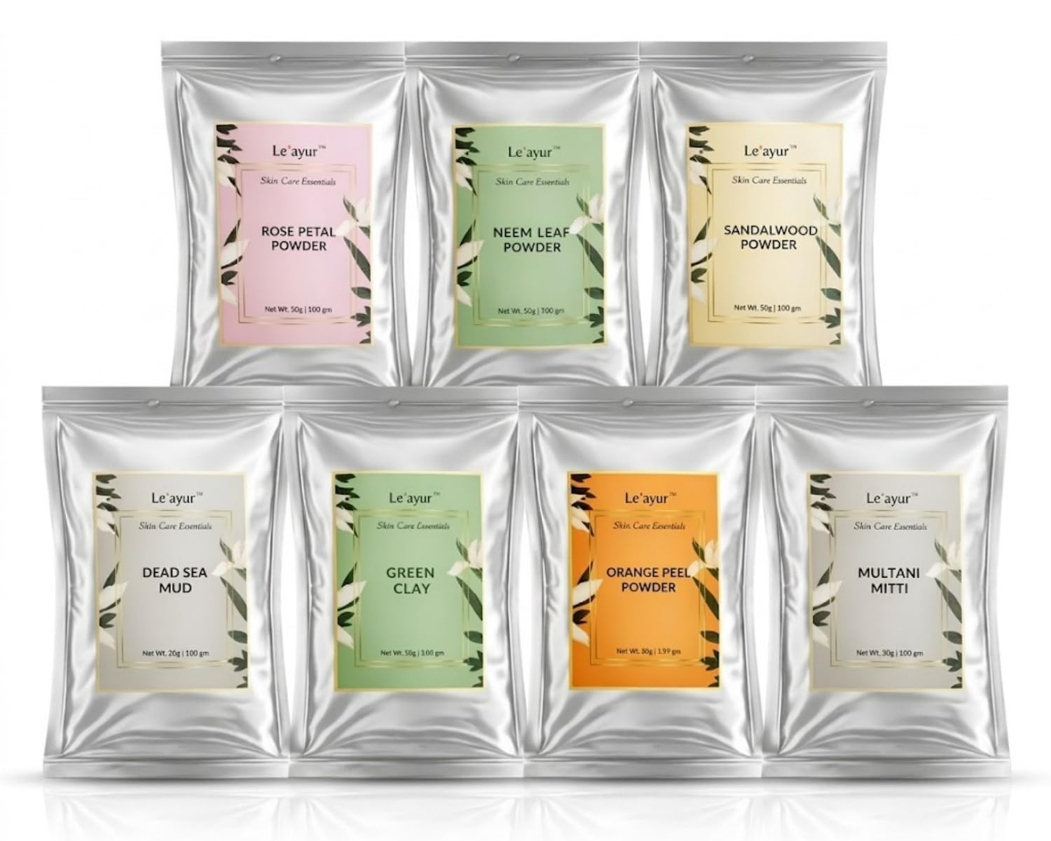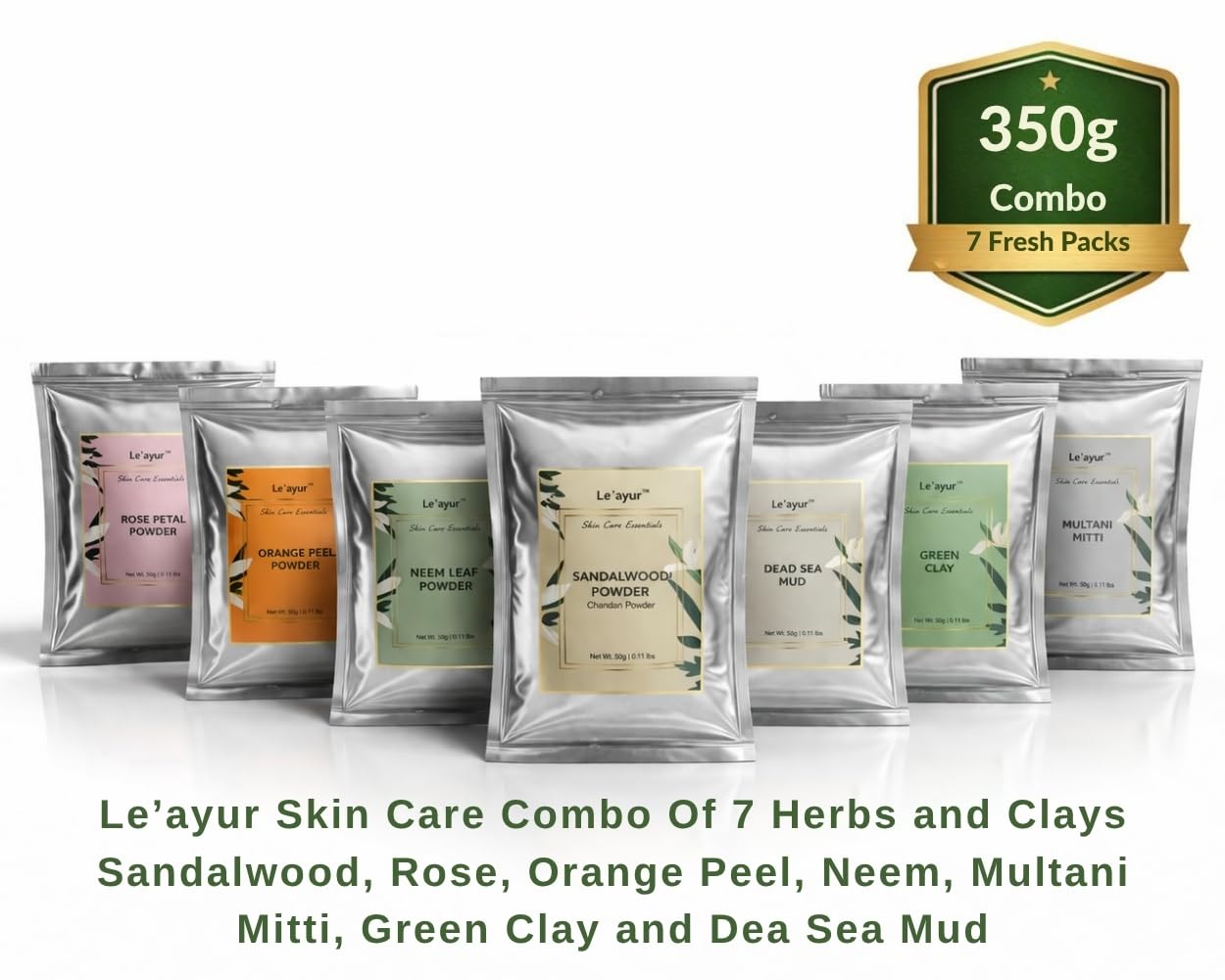 Le’ayur Skincare Combo Of Multani Mitti, Rose Petal, Orange Peel, Neem, Sandalwood, French Green Clay, Dead Sea Clay Powders 50-50 Grams Each