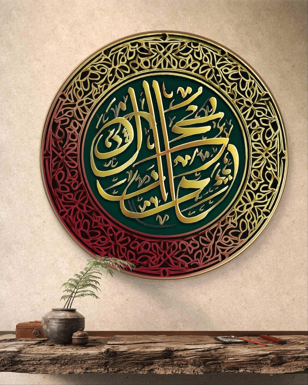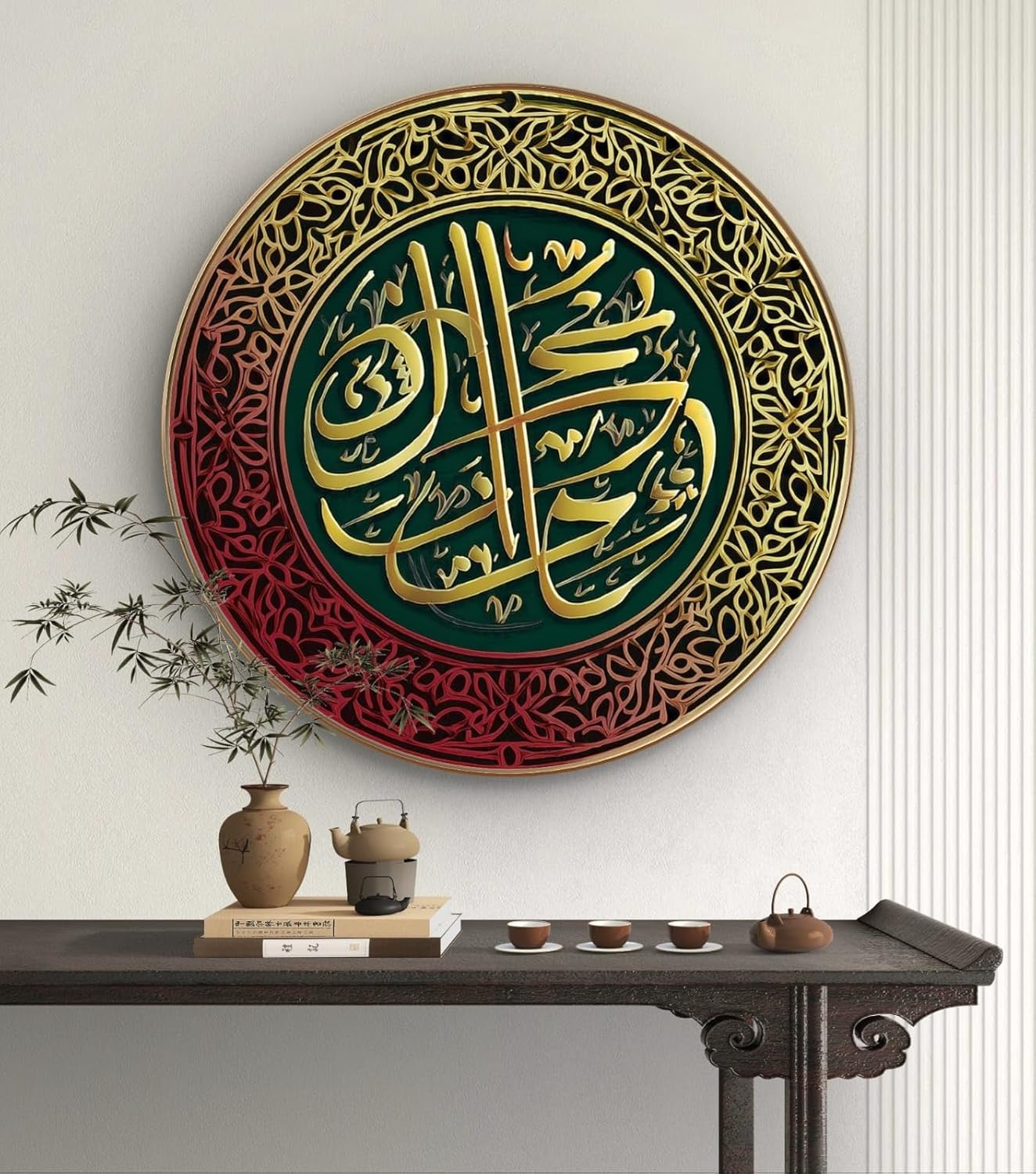 Stunning Arabic Calligraphy: Features gold-embossed Islamic script on a vibrant dual-tone background.