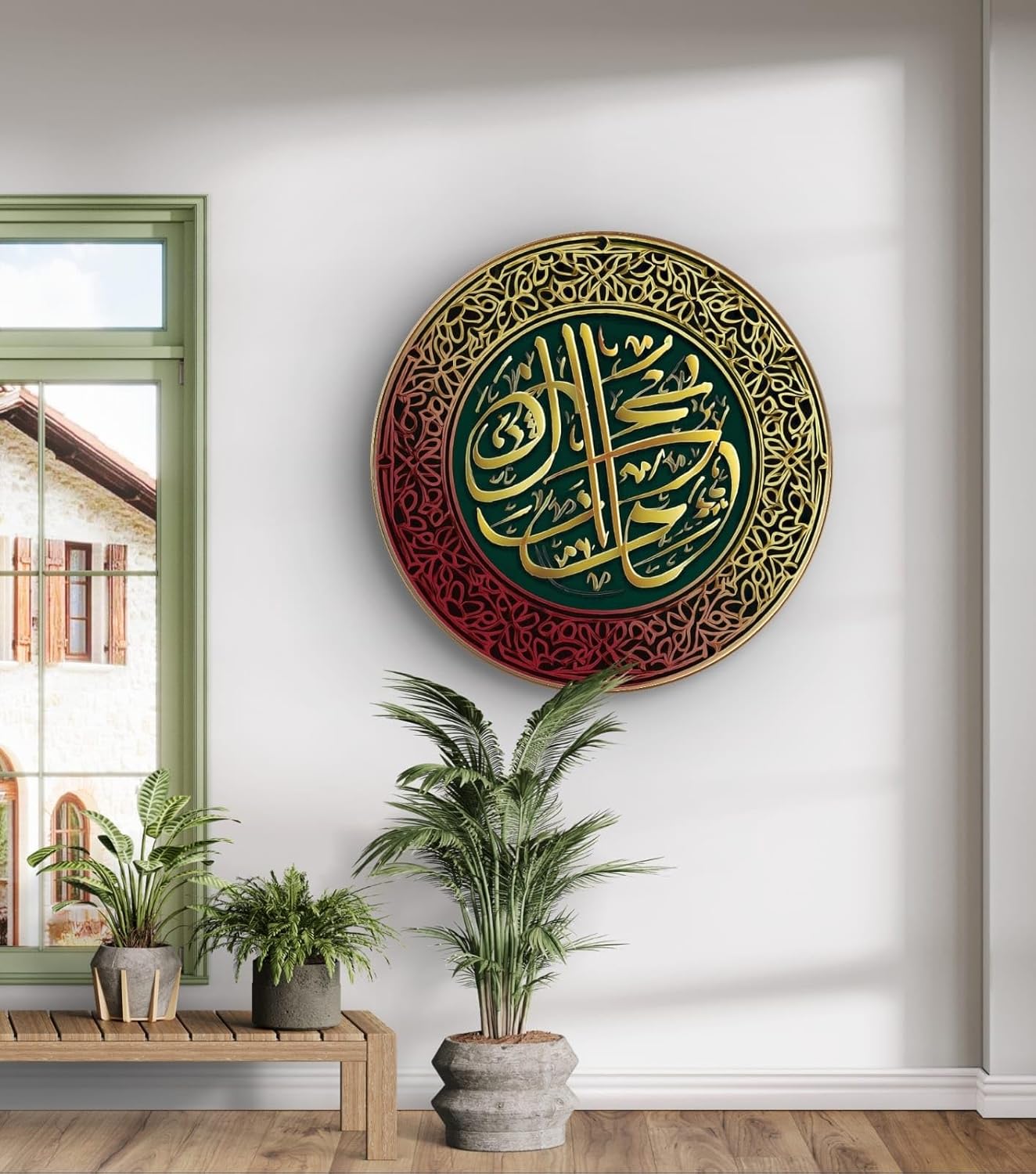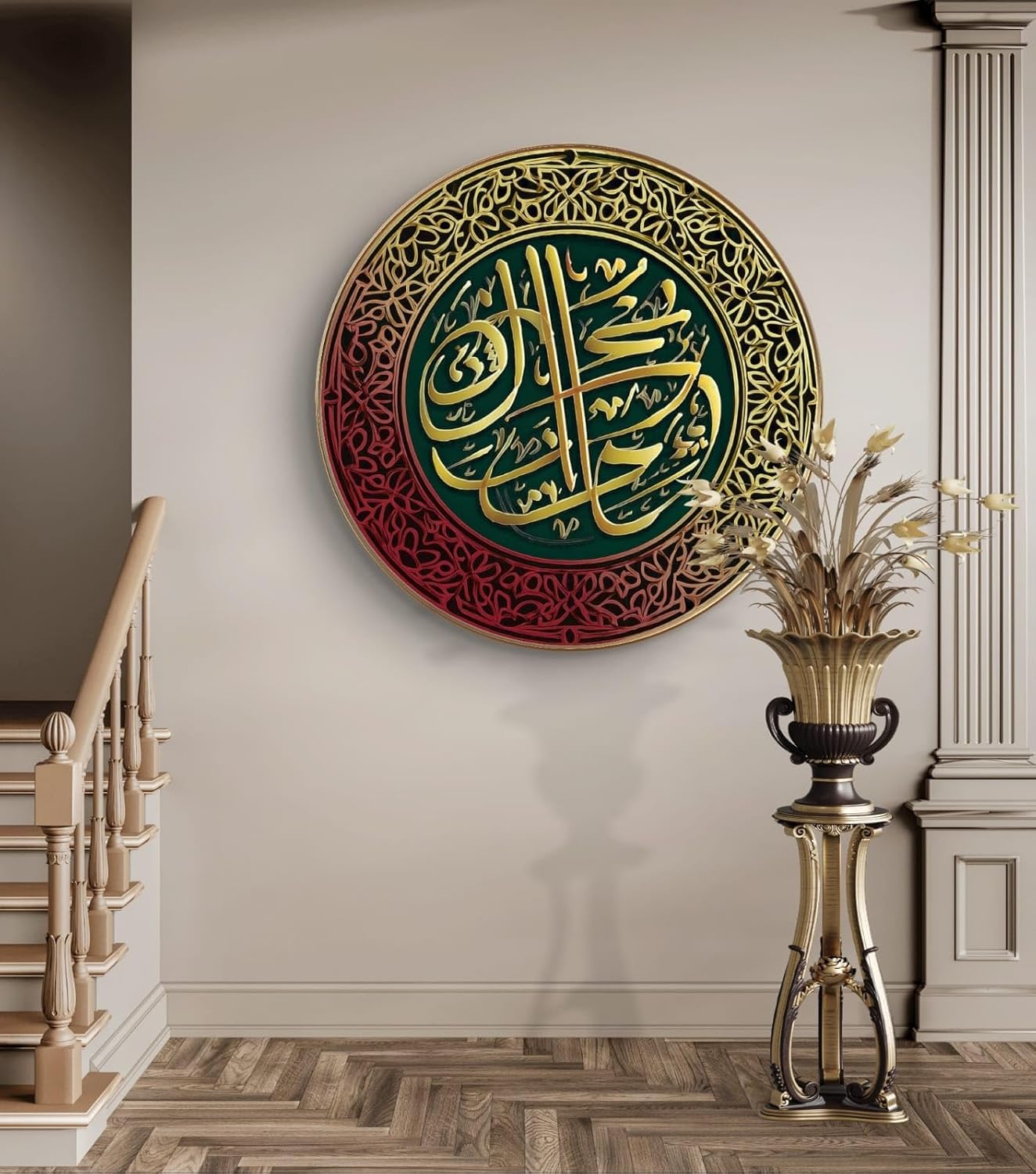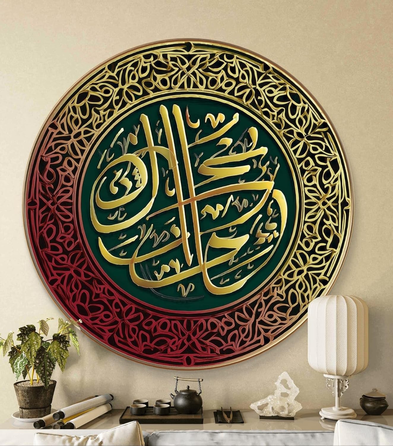 Livin’luxe Islamic Calligraphy Wall Art with Golden Frame – Arabic Script Painting in Green – Muslim Wall Decor for Home, Prayer Room & Office – Elegant Round Spiritual Artwork 16 Inch x 16 Inch