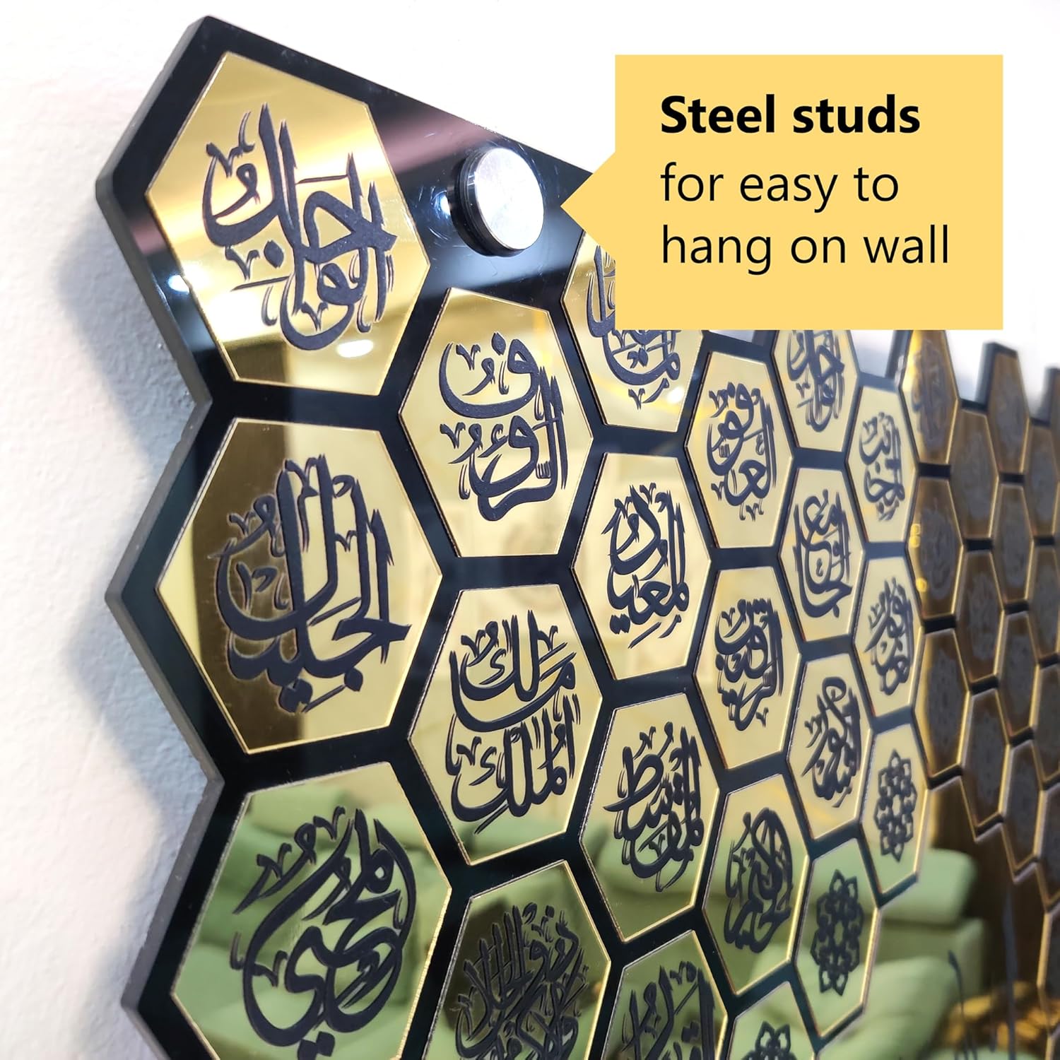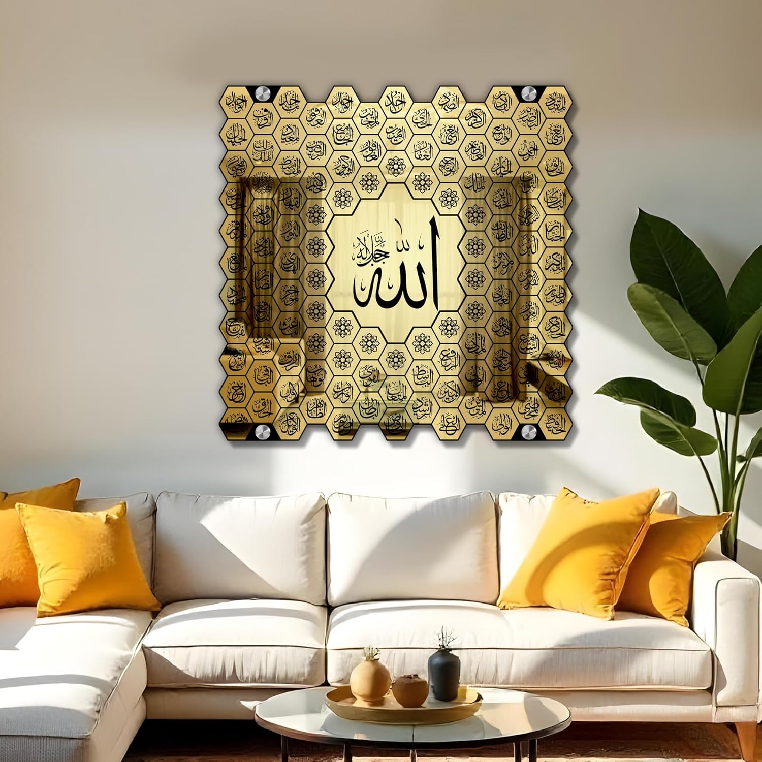 Luxury 99 Names of Allah Islamic Acrylic Wall Art | Golden Honeycomb Calligraphy with Glass Finishing Decor | Allah Name for Home, Mosque, Office | Muslim Gift | Islamic Wall Hanging | 24×24 Inch (Golden & Black)