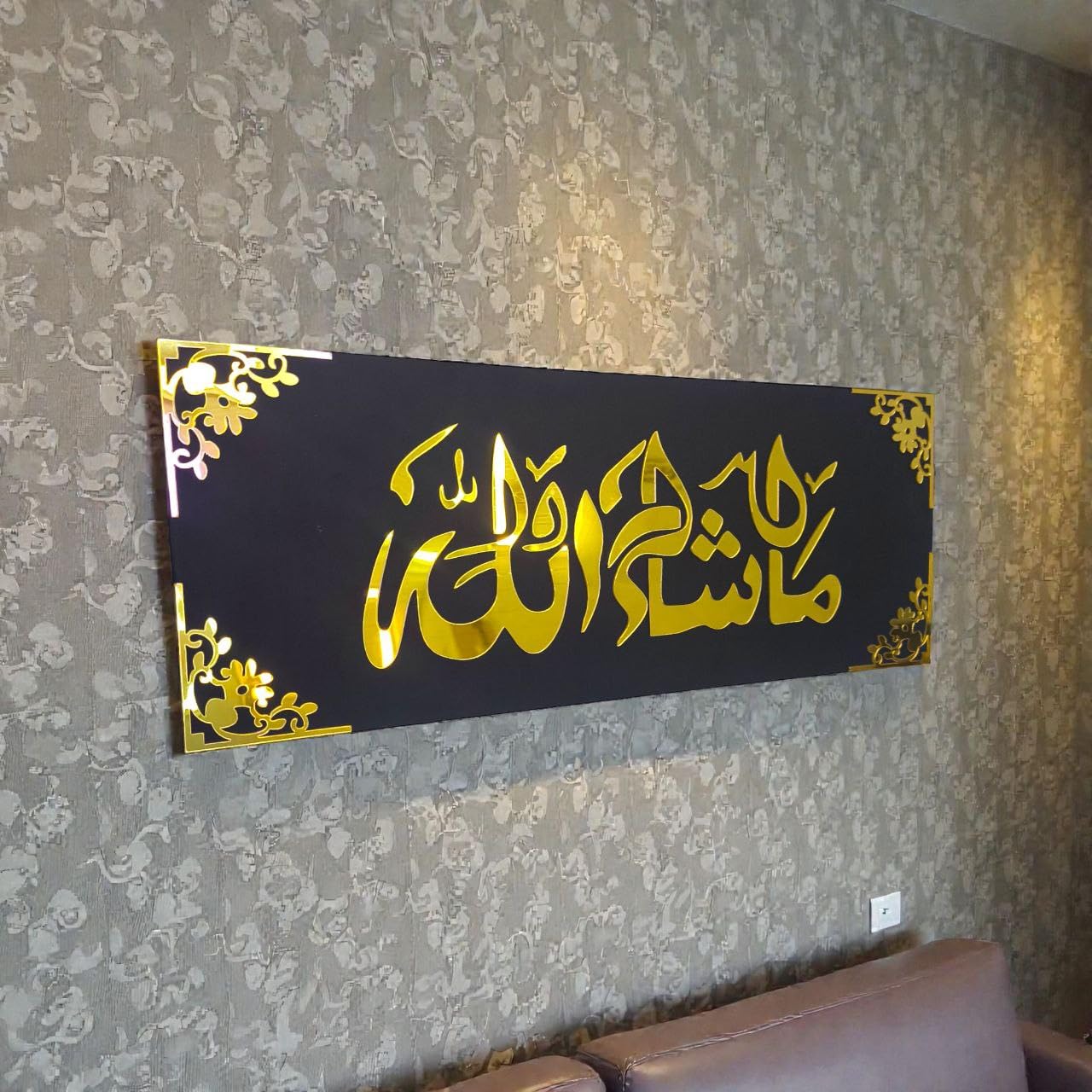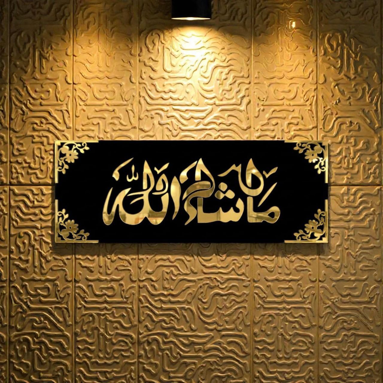 Mashallah Arabic Calligraphy Wall Art, Gold and Black, Acrylic with Wood Base, 40×15 cm, Modern Contemporary Islamic Style, Decorative Floral Corner Design