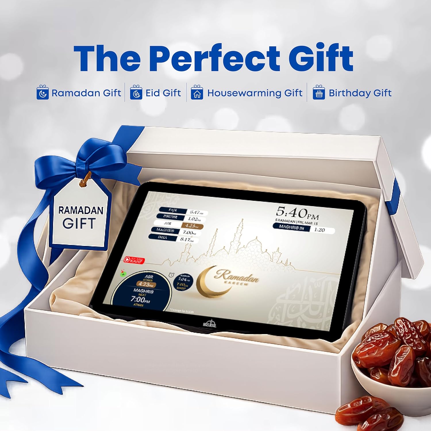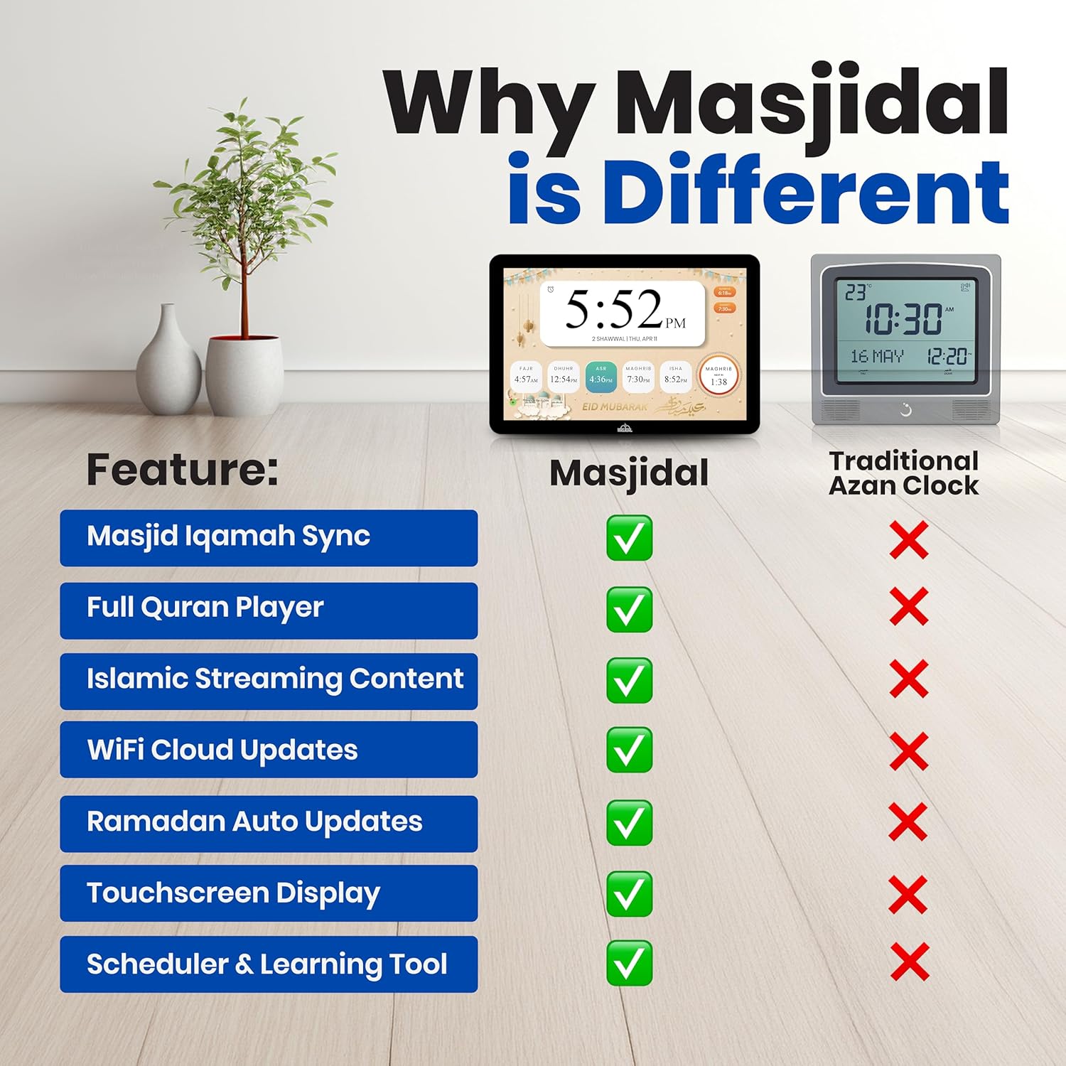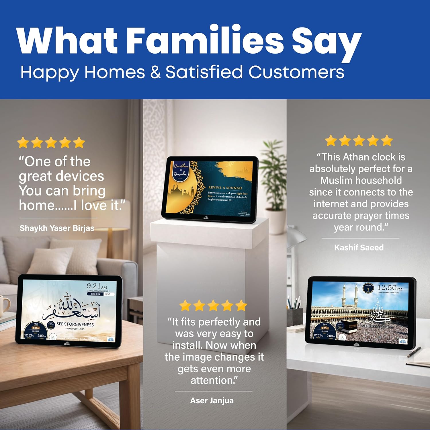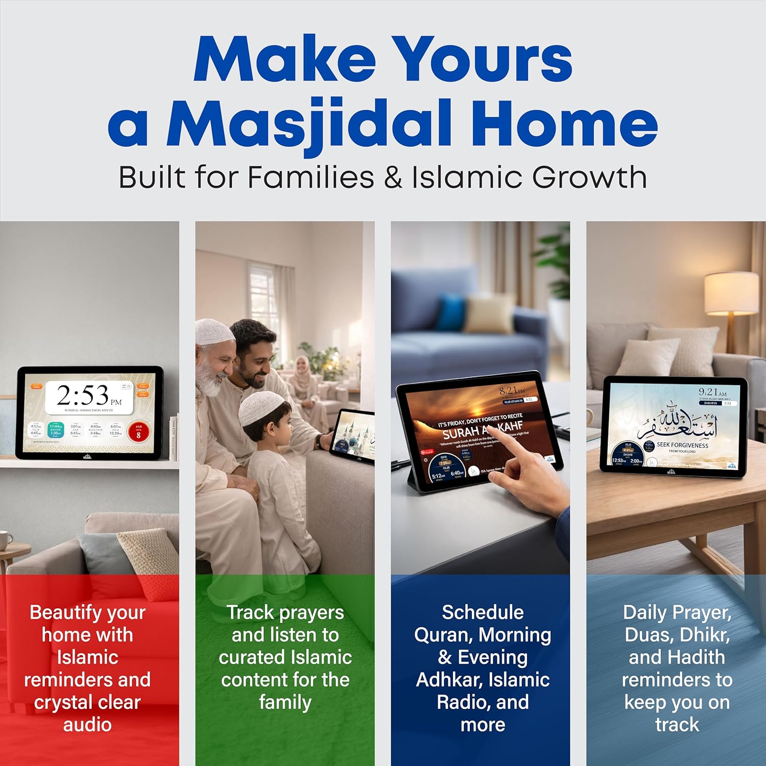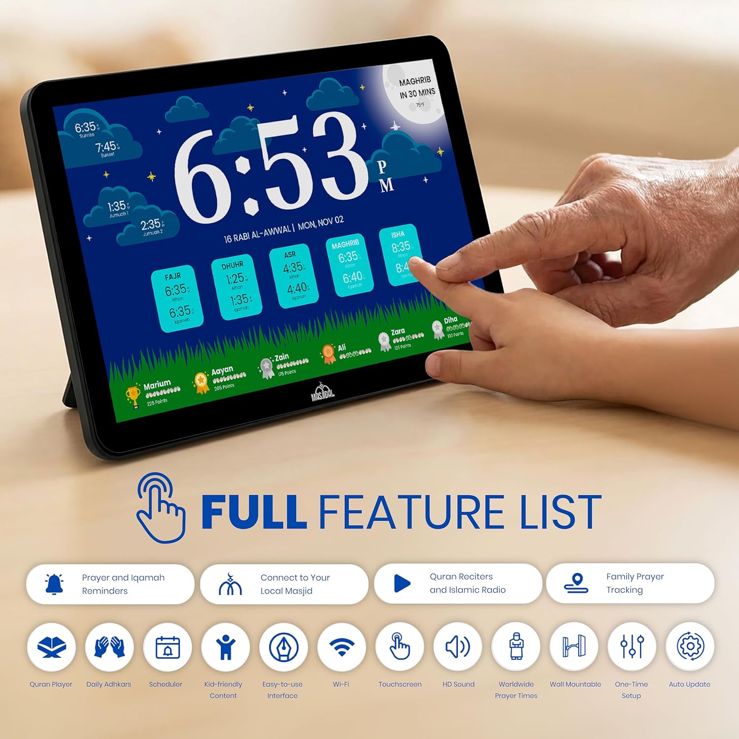 SMART ALL-IN-ONE ISLAMIC PRAYER CLOCK: The most advanced digital azan clock for Muslim homes. Automatically displays accurate worldwide prayer and iqamah times, plays athan five times daily, streams halal Islamic content, and replaces traditional mosque clocks with a smart WiFi-connected Islamic hub.