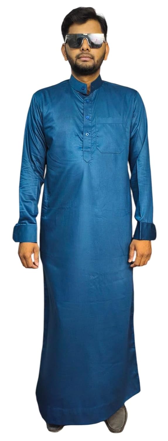 Experience timeless elegance with this traditional Saudi-style Thobe Kurta in a striking dark blue shade. This full-sleeve garment exemplifies classic Islamic fashion, perfect for both regular wear and special occasions like weddings or religious ceremonies. The regular fit design ensures comfort while maintaining a dignified appearance. Crafted with attention to detail, it features a mandarin collar, front buttons, and a convenient chest pocket. The ankle-length cut and clean lines create a sophisticated silhouette suitable for namaz and formal gatherings alike. The versatile dark blue colour makes it an excellent choice for your wardrobe, whether you’re attending a party or going about your daily activities. The comfortable fit and premium stitching allow for easy movement while maintaining a distinguished look. This Thobe Kurta seamlessly blends traditional design elements with contemporary styling, making it a must-have piece for those who appreciate authentic Islamic attire. AL Raza Tailor Jhubba for Men Saudi Style Kurta Dark Blue Colour Regular wear Wedding Party jubba Full Sleeve Plane Casual Boys namaz ke liye Thobe Men Traditional Arabic Thobe, dark blue Lightweight & Modest Wear Round Neck Traditional Cotton Full Length Mandarin Collar Robe, Casual Islamic Festivals Wear kurta Stylish