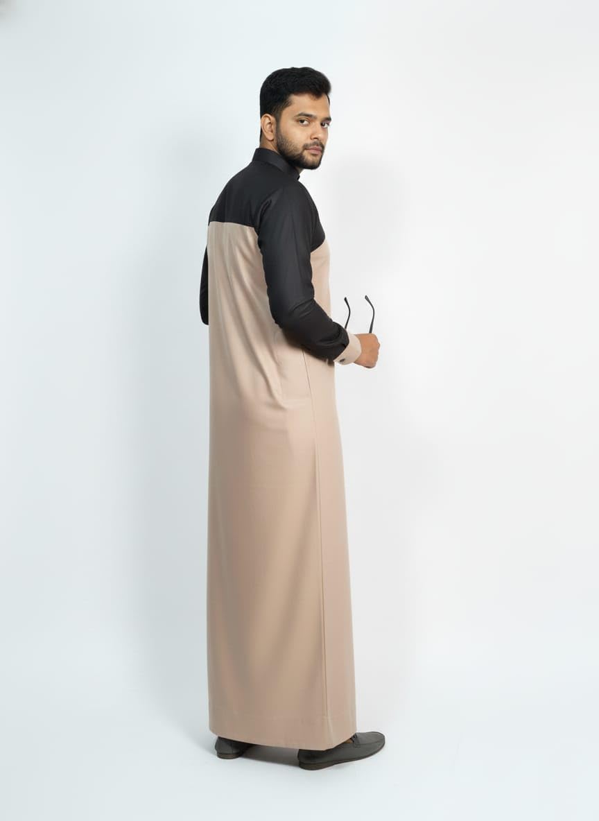 Men’s Traditional Saudi Style Thobe Jubba, Light Brown and Black Two-Tone Design, Full Sleeve Islamic Dress with Chest Pocket, Wedding and Formal Wear skin colour