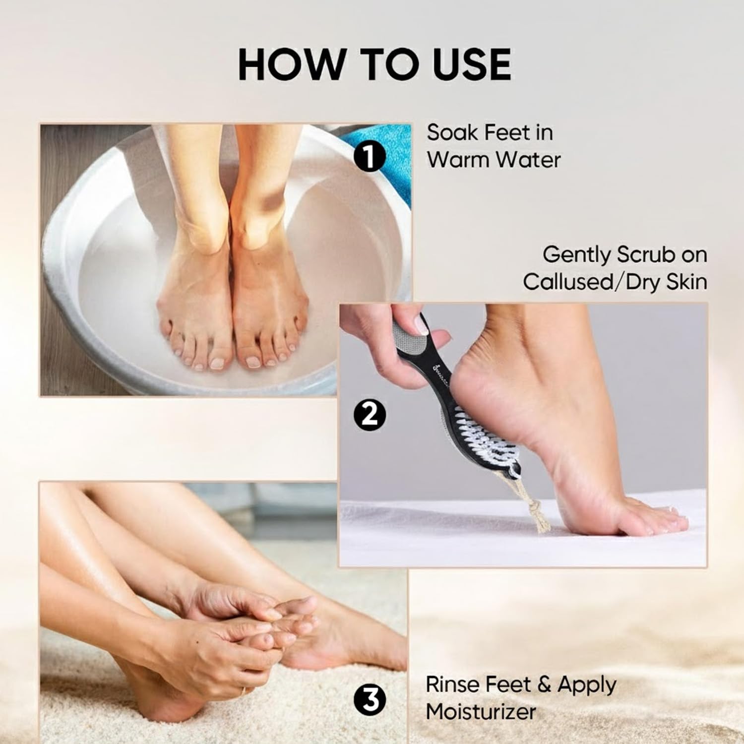 Experience salon-quality foot care at home with the Midazzle 4-in-1 Pedicure Foot File Brush. Designed for complete pedicure grooming, this multifunction foot scrubber includes a cleansing brush, pumice stone, metal rasp file, and buffing surface. Easily remove dead skin, cracked heels, rough patches, hard calluses, and dry feet for softer, smoother skin. The ergonomic handle offers a comfortable grip and better control during use. Perfect for men and women, this reusable pedicure tool keeps your feet fresh, polished, and healthy. Add Midazzle foot care essential to your daily beauty routine today for long-lasting softness, comfort, confidence, and professional results everyday.