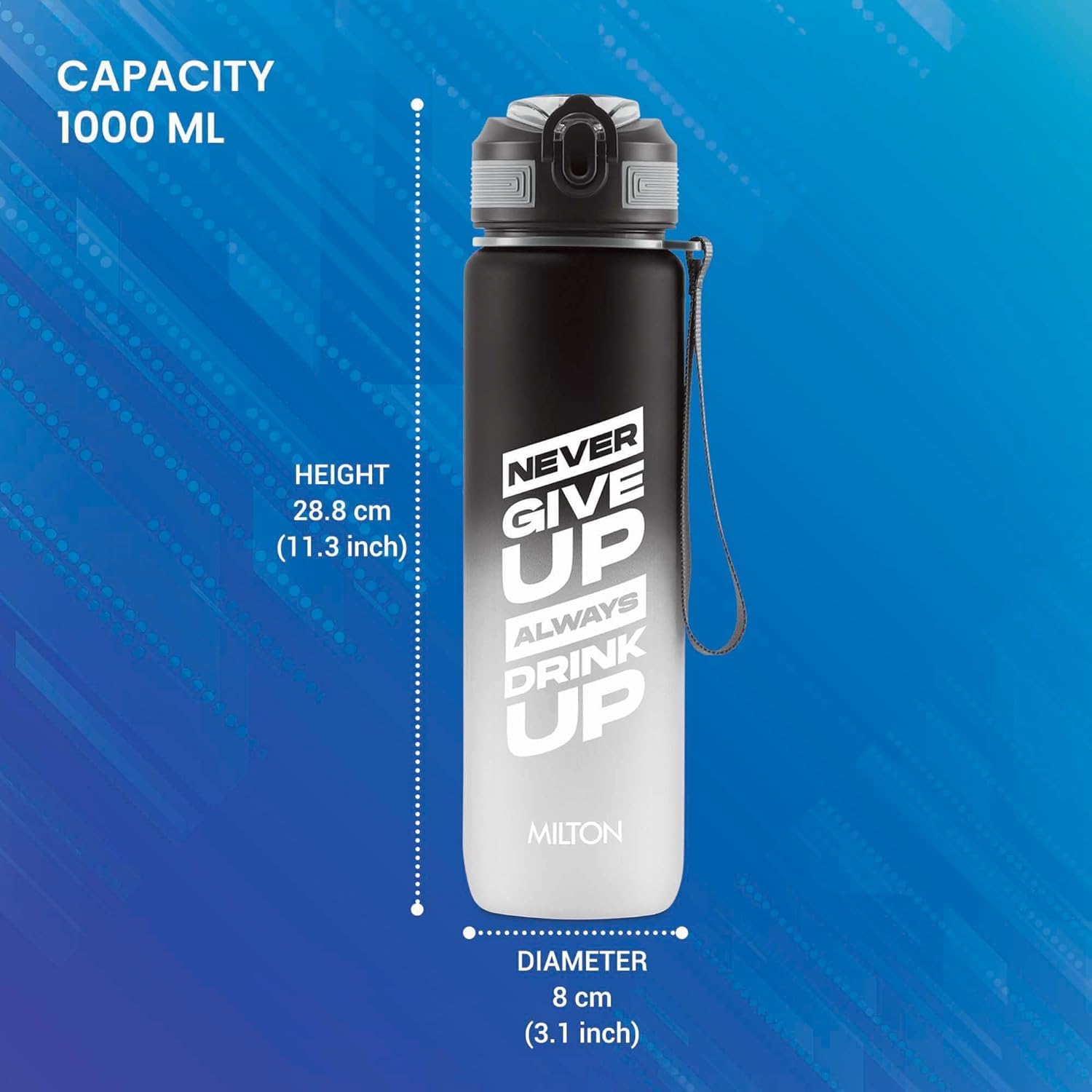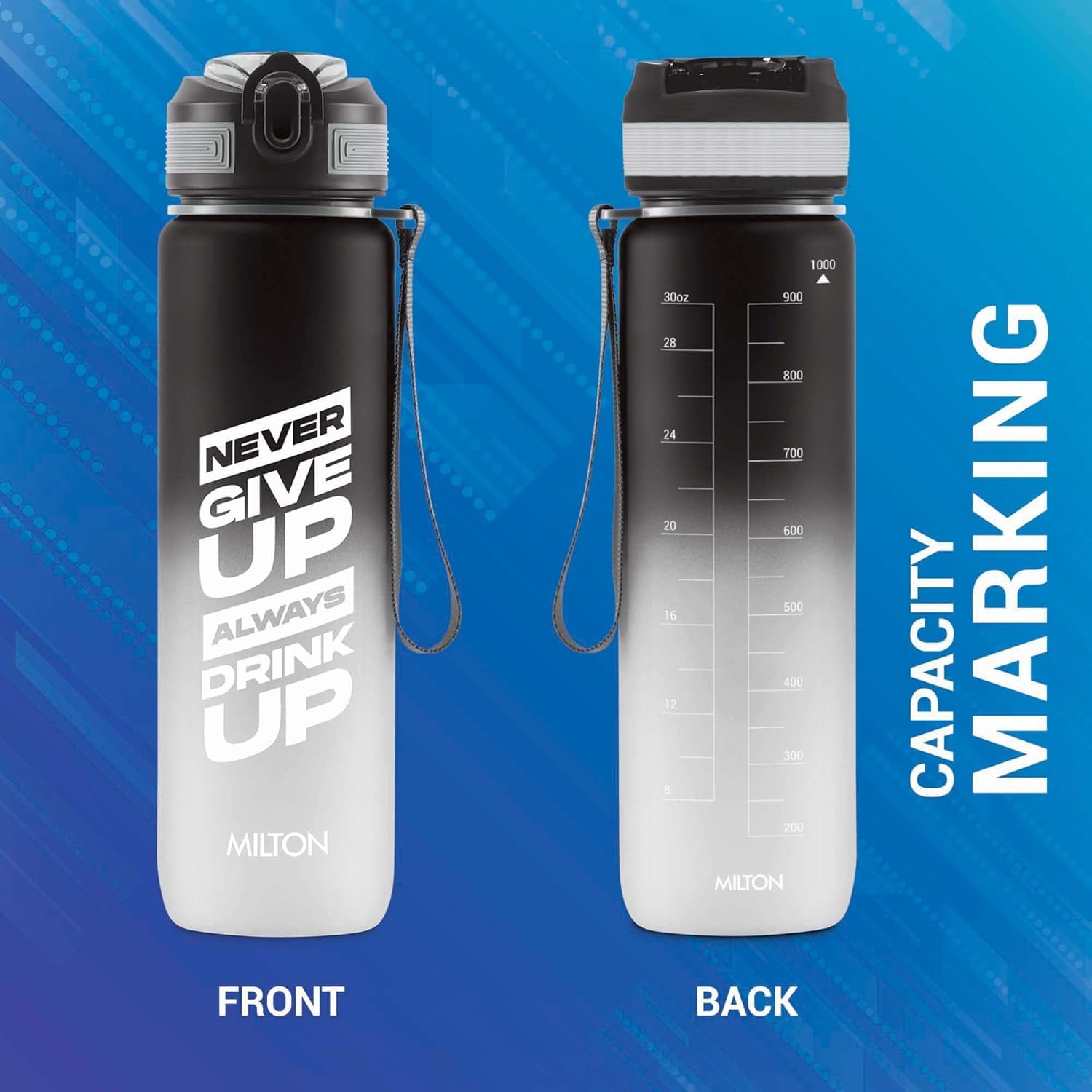 MILTON Gen’Z Water Bottle 1 ltr (Stay Strong), Motivational Water Bottles With Leak Proof Flip-Top Cap & Capacity Mark, Gym Bottle Sipper Water Bottle For Adults, Plastic, Black