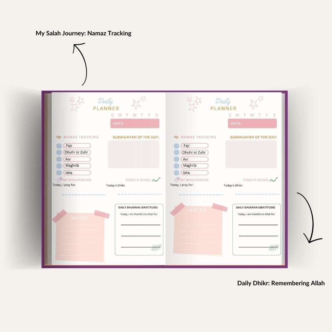 My Path to Faith is a purpose-based Islamic journal designed to help young Muslims balance deen and dunya through mindful planning and reflection. This is not a dated one-year diary. It is created for flexible, long-term use, allowing you to write at your own pace without pressure. Inside, you’ll find 120 thoughtfully designed pages, including: Salah tracking pages Weekly planner for organized living Daily dhikr and gratitude pages Quranic ayah reflection pages to write your favorite verses, their meaning, and why they inspire you Nafs (inner-self) reflection pages Notes and daily thoughts sections You can start journaling anytime , whether by tracking your prayers, planning your week, or reflecting on Quranic verses. My Path to Faith is more than a journal; it is a companion for spiritual growth, consistency, and staying connected to Allah in everyday life.