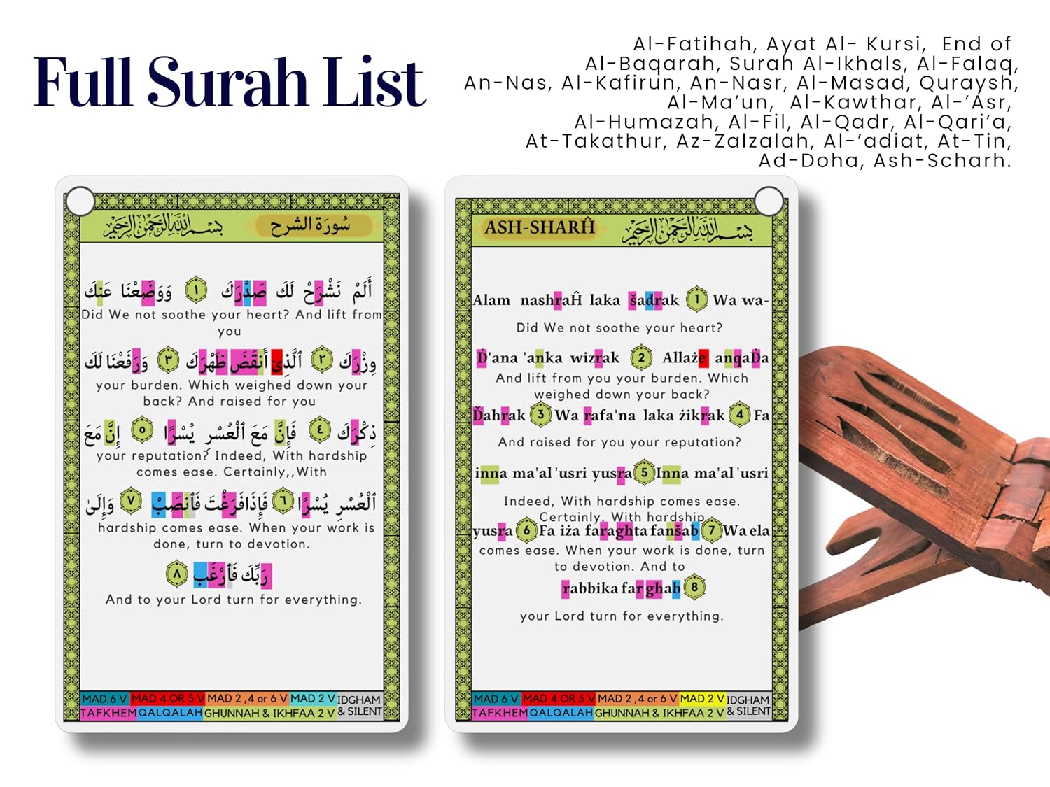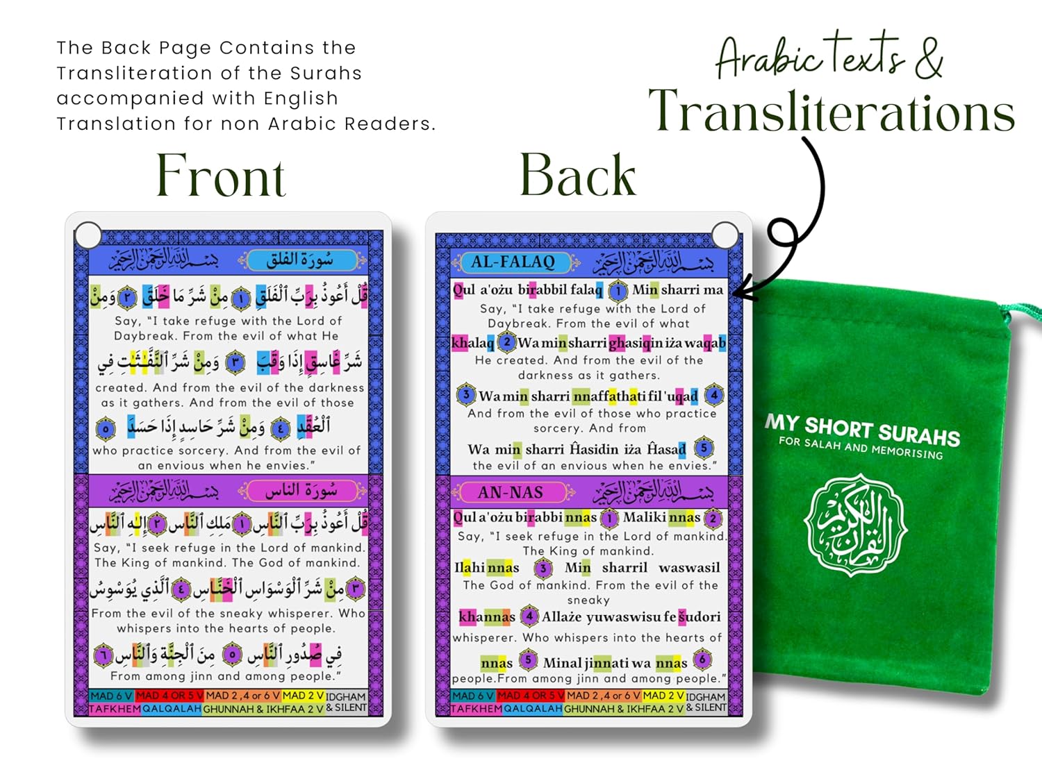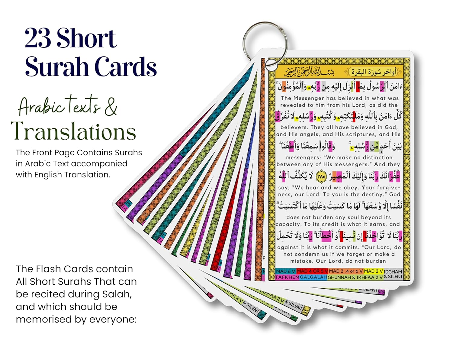 It contains Arabic text with English translation and Tajweed color codes, on the back of the Surah cards you will find the same Surah in English (transliteration) for non Arabic readers!