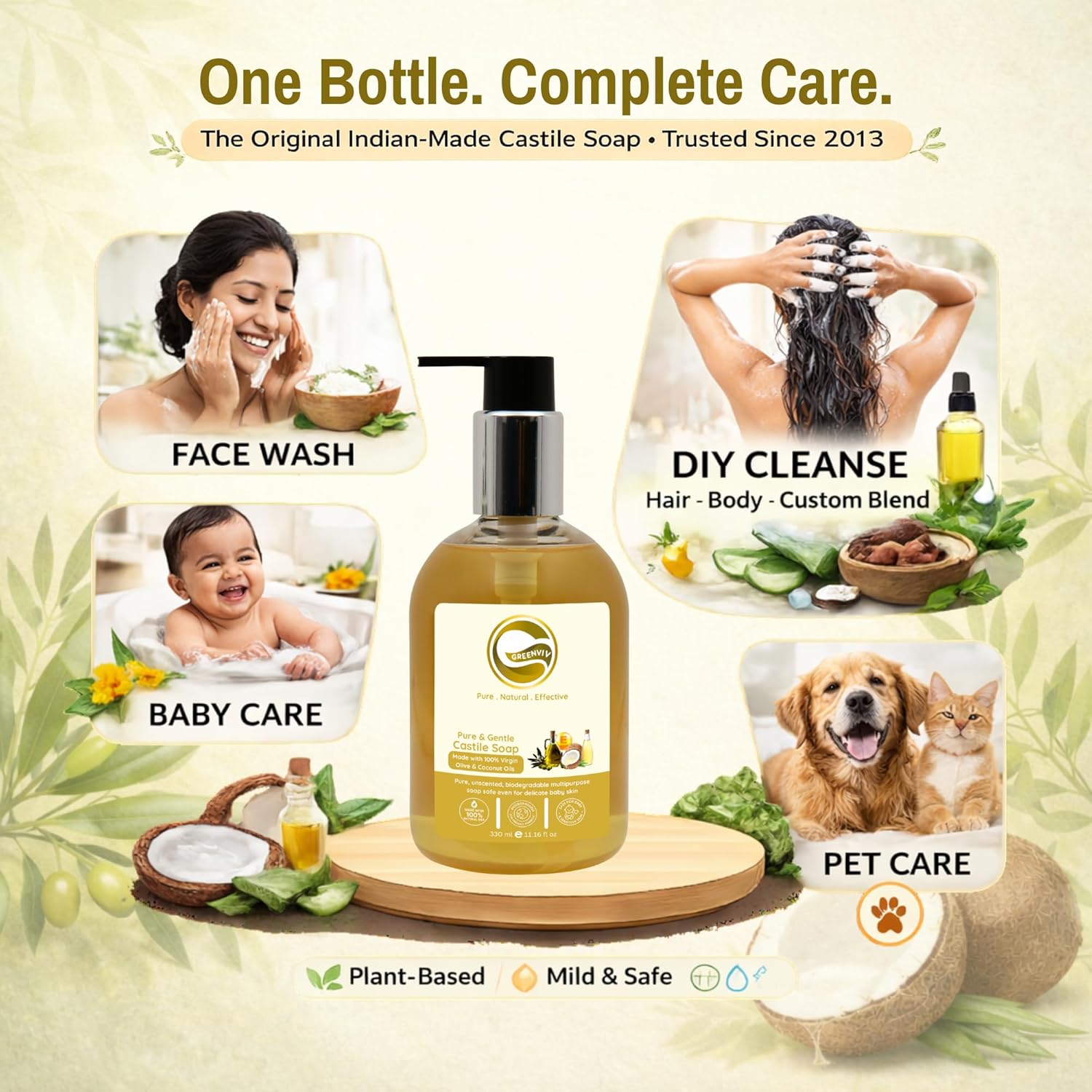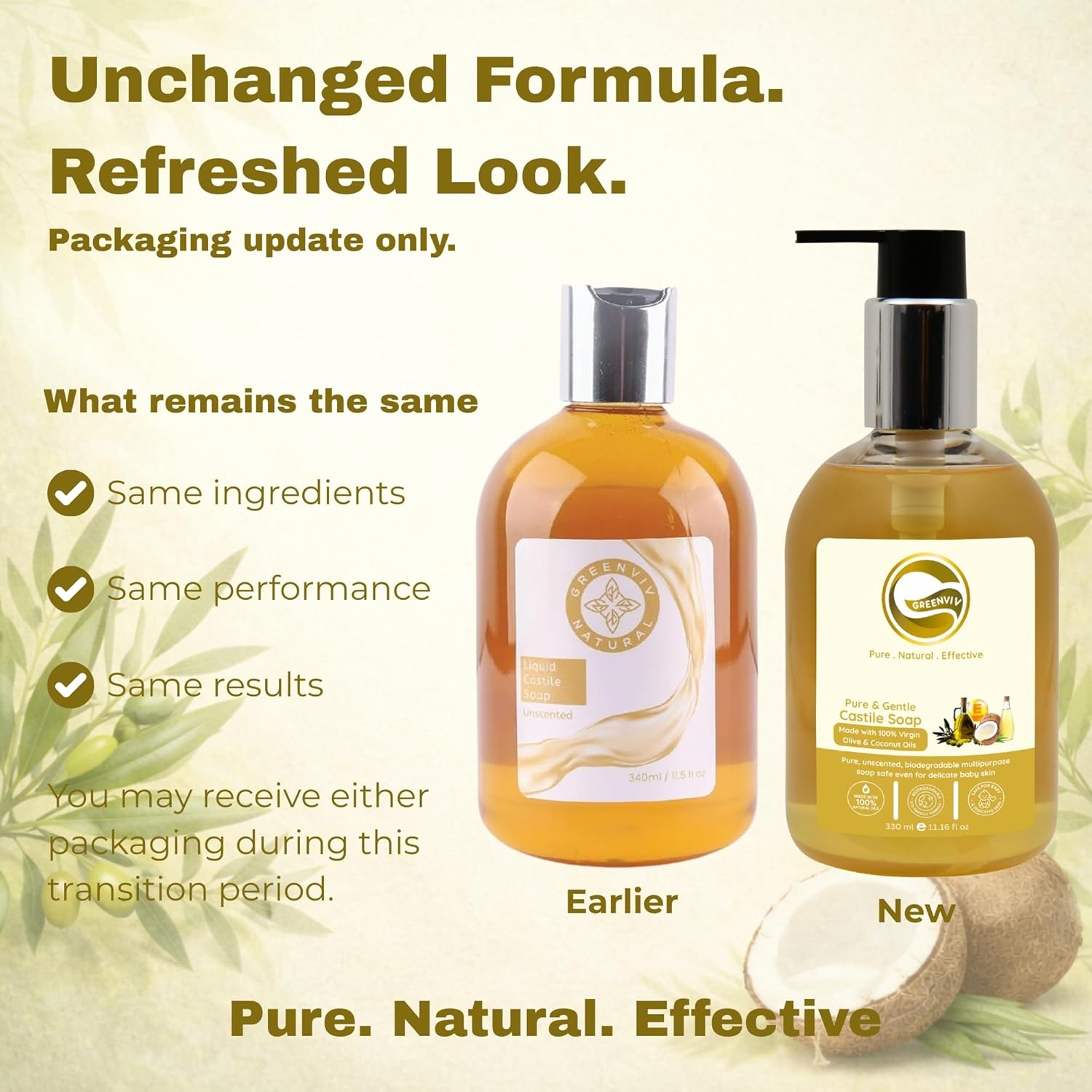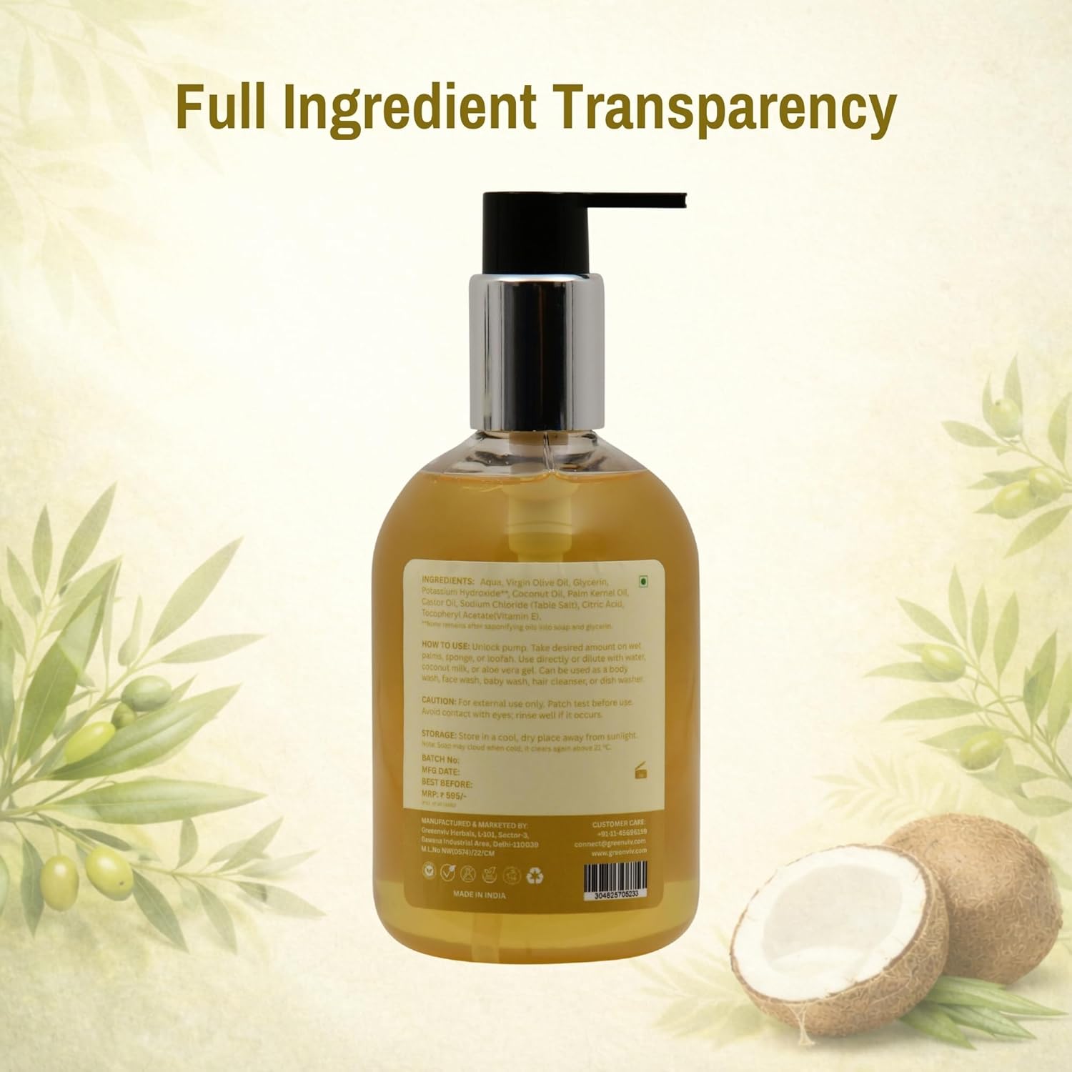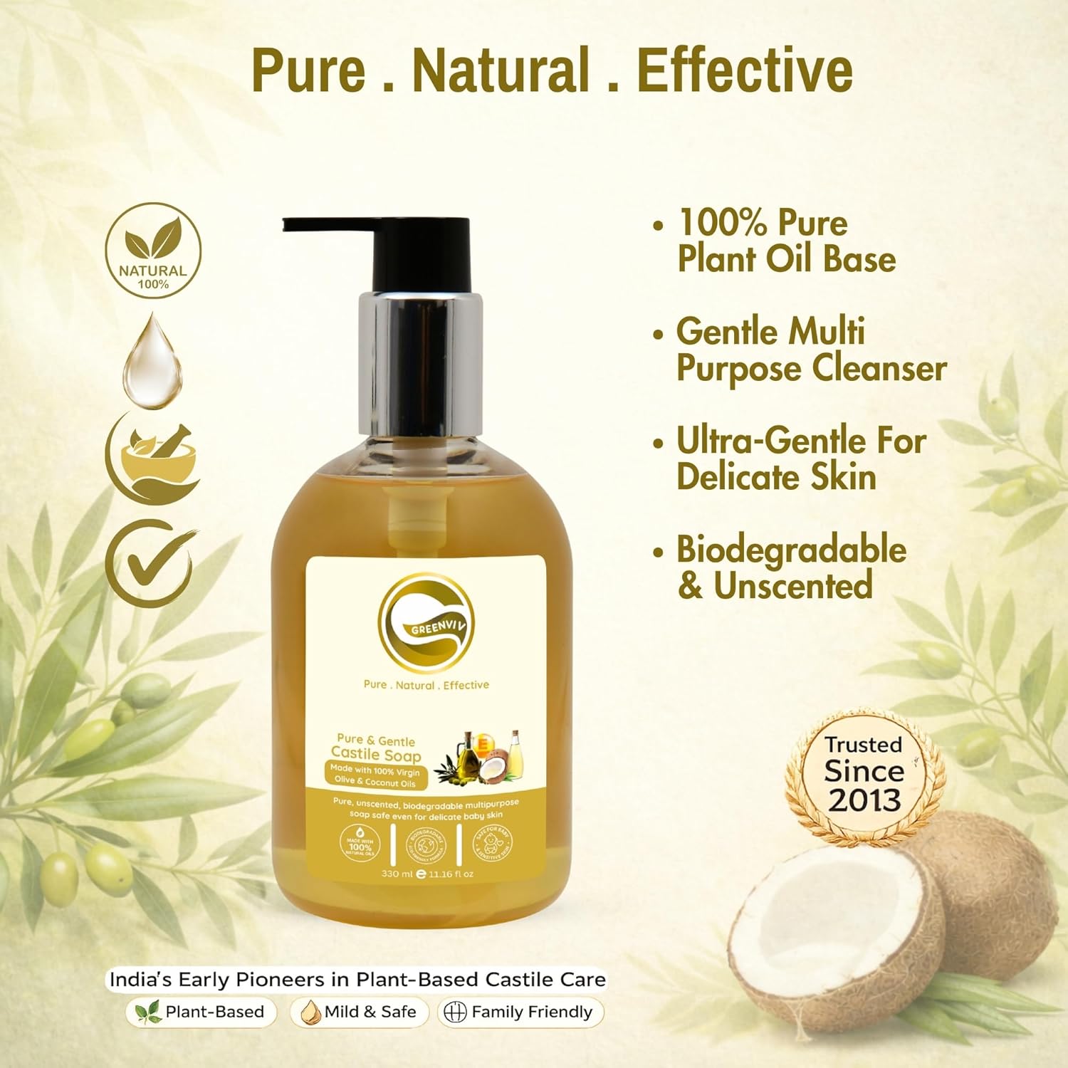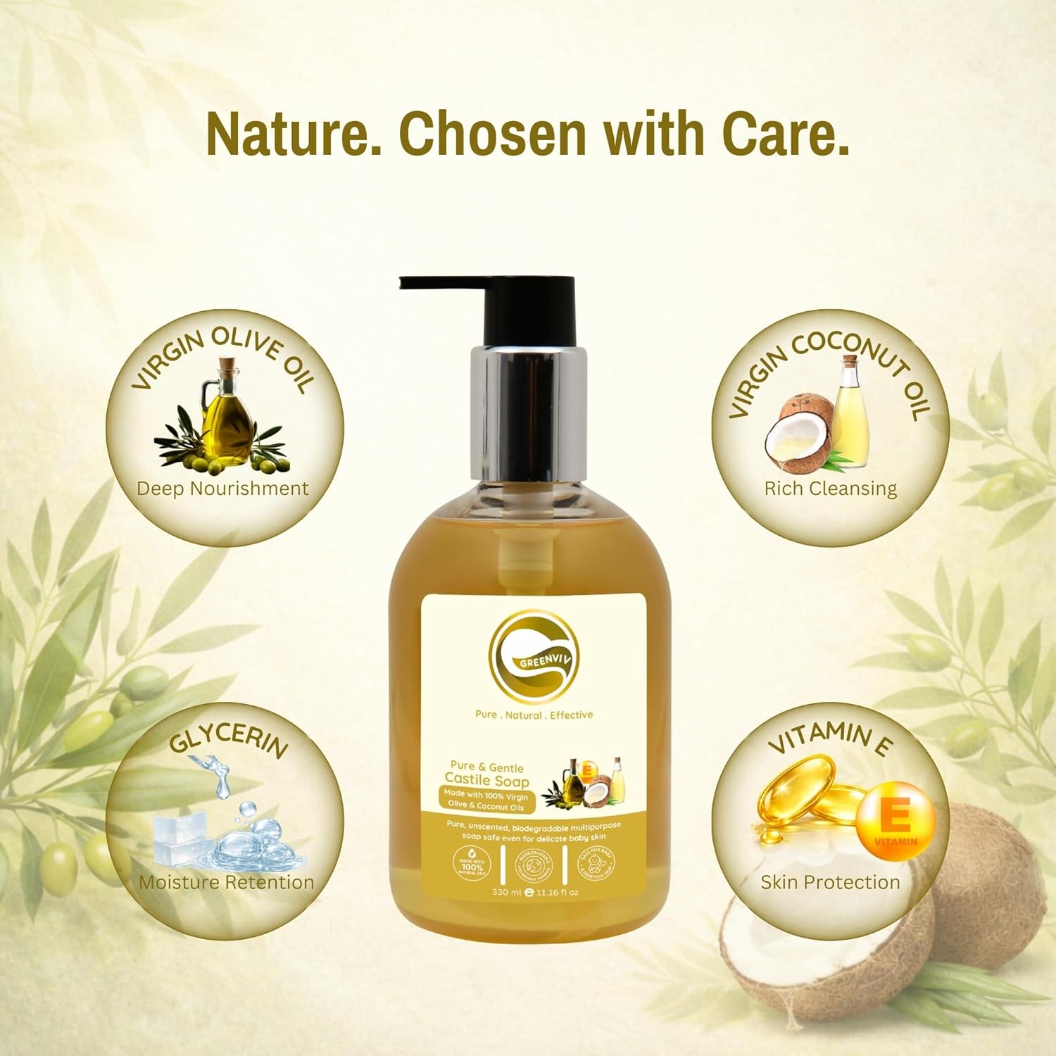 Natural Liquid Castile Soap | with Olive, Coconut, Castor & Palm Kernel Oils | Gentle Multi-Purpose Cleanser for Baby, Face, Body & DIY soap base | Vegan & Biodegradable | 330ml