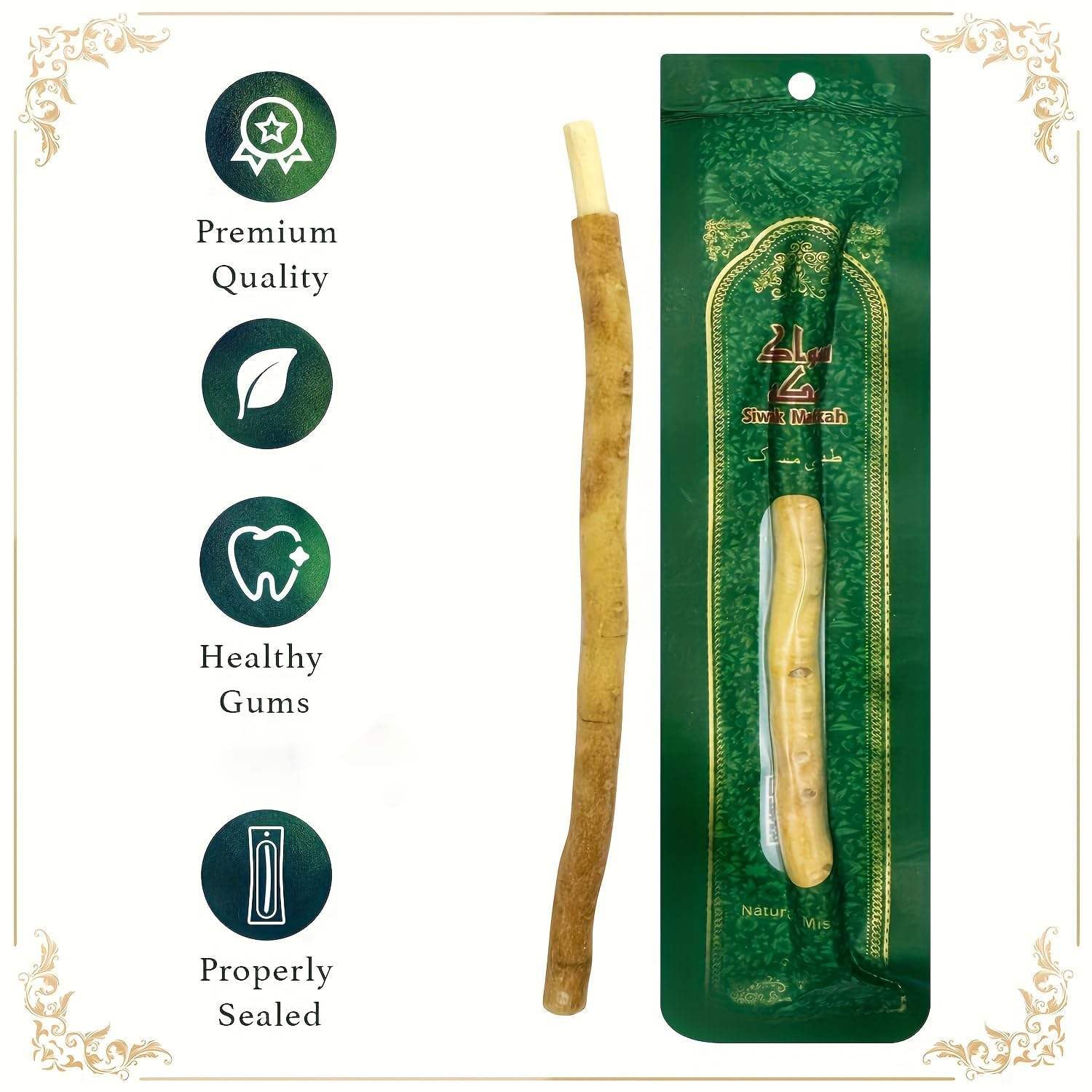 Natural Miswak stick toothbrush | Organic Miswak Teeth Cleaning Stick | Herbal Chewing Stick Toothbrush Fresh Breath Oral Care | Miswak toothbrush Natural Organic Datun Sticks | 6 Pcs The Natural Miswak Stick Toothbrush—also known as Organic Miswak Datun—is a time-honored, plant-based oral care solution trusted for centuries. Made from carefully selected miswak (Salvadora persica) wood, this herbal chewing stick toothbrush delivers effective teeth cleaning, fresher breath, and healthier gums—without chemicals, plastics, or toothpaste. Ideal for daily use, this 6-piece pack offers a sustainable, travel-friendly, and eco-conscious alternative to modern toothbrushes. What is Miswak (Datun)? Miswak is a natural teeth-cleaning twig derived from the Salvadora persica tree. When chewed, its fibers form a soft brush that cleans teeth mechanically while releasing naturally occurring antibacterial and antiseptic compounds. This unique combination supports oral hygiene in a simple, natural way. Key Features 100% Natural & Organic: Pure miswak wood—no additives, dyes, or preservatives Herbal Oral Care: Naturally freshens breath and supports gum health Chemical-Free Cleaning: No toothpaste or fluoride required Eco-Friendly & Plastic-Free: A sustainable alternative to plastic brushes Compact & Travel-Ready: Use anytime, anywhere—no water needed Value Pack (6 Pcs): Long-lasting supply for personal or family use Health & Oral Care Benefits 🦷 Deep Natural Cleaning The fibrous texture gently scrubs away plaque and surface stains, helping maintain clean, bright teeth. 🌿 Fresh Breath Natural essential oils and plant compounds neutralize odor-causing bacteria for long-lasting freshness. 🩺 Healthy Gums Miswak’s mild astringent properties help strengthen gums and reduce inflammation. 🦠 Antibacterial Protection Naturally occurring agents help inhibit harmful oral bacteria that cause cavities and gum issues. 🧘 Gentle & Safe Soft fibers massage gums and are suitable for sensitive teeth and daily use. How to Use Miswak Stick Cut or peel about 1 cm from one end of the stick. Chew gently until the fibers spread into a brush-like tip. Brush teeth using gentle circular motions. Rinse the tip after use and trim every few days for freshness. Tip: Use 2–3 times daily for best results.