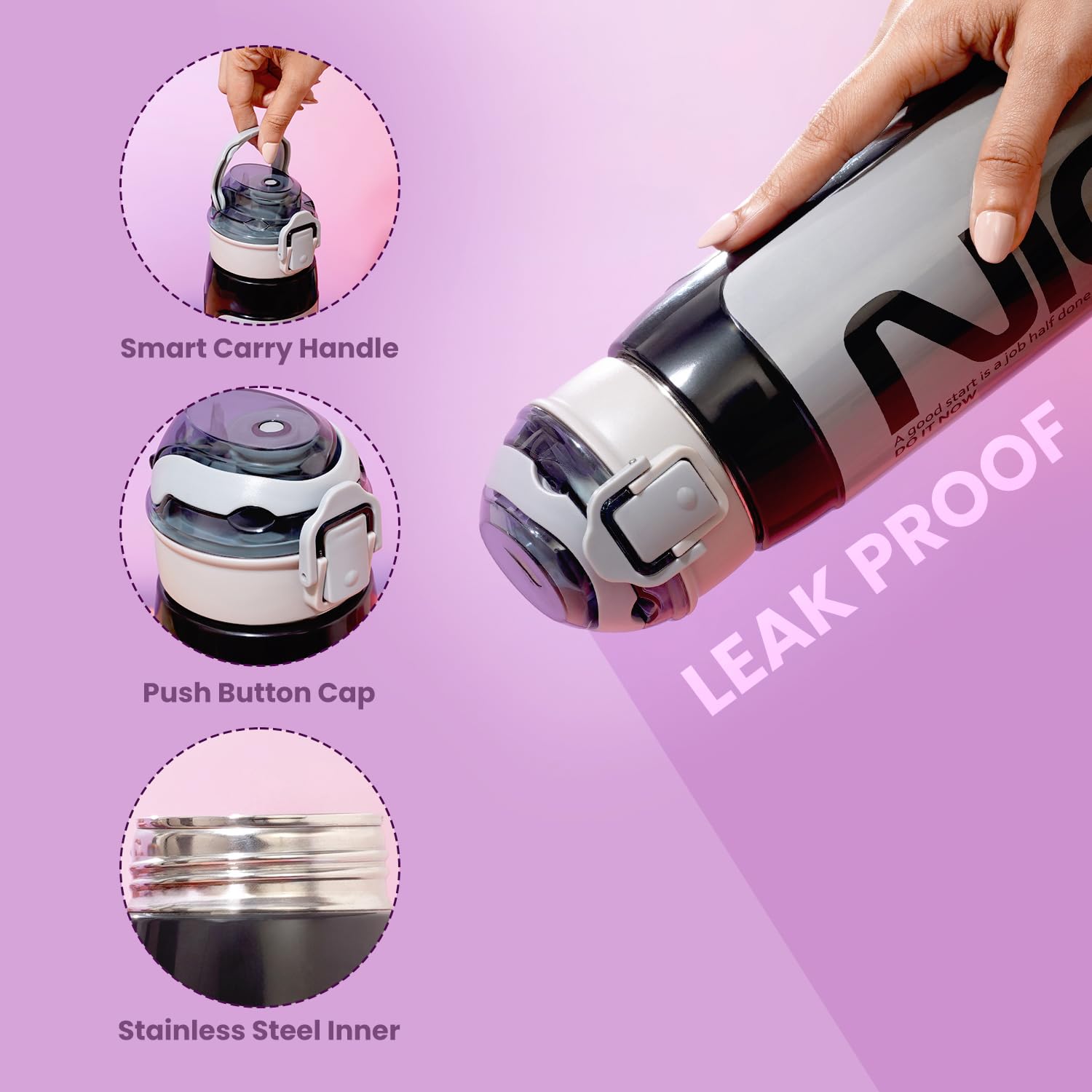 Leakproof Push-Button Cap: Equipped with leakproof technology and a covered spout, the bottle’s secure lid prevents spills, ensuring worry-free storage inside bags during commutes, hikes, or workouts.