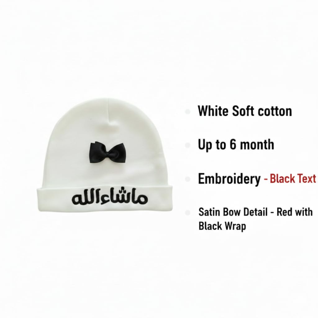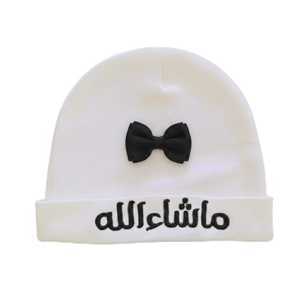 Newborn Baby Beanie Hat, White Soft Cotton with Black Mashallah Arabic Embroidery and Satin Bow Detail, Islamic Infant Gift, Fits up to 6 Months