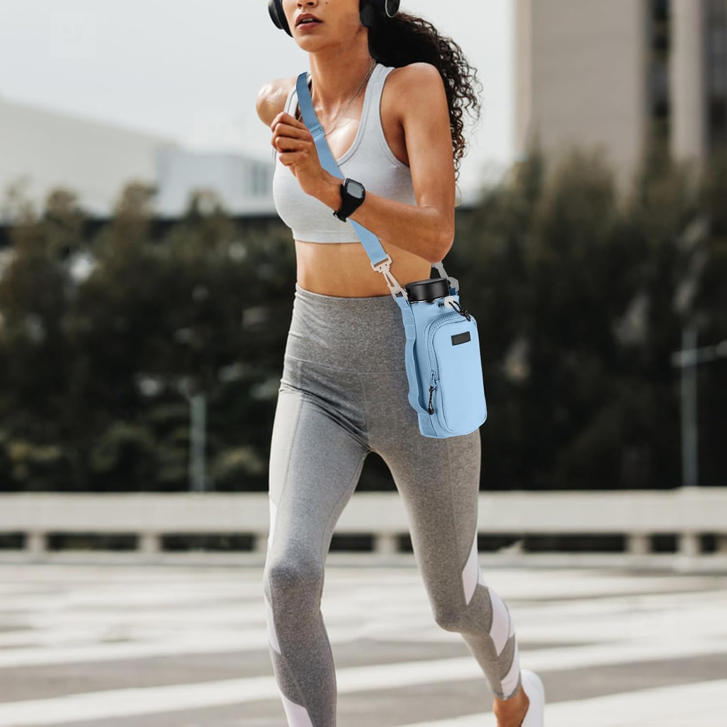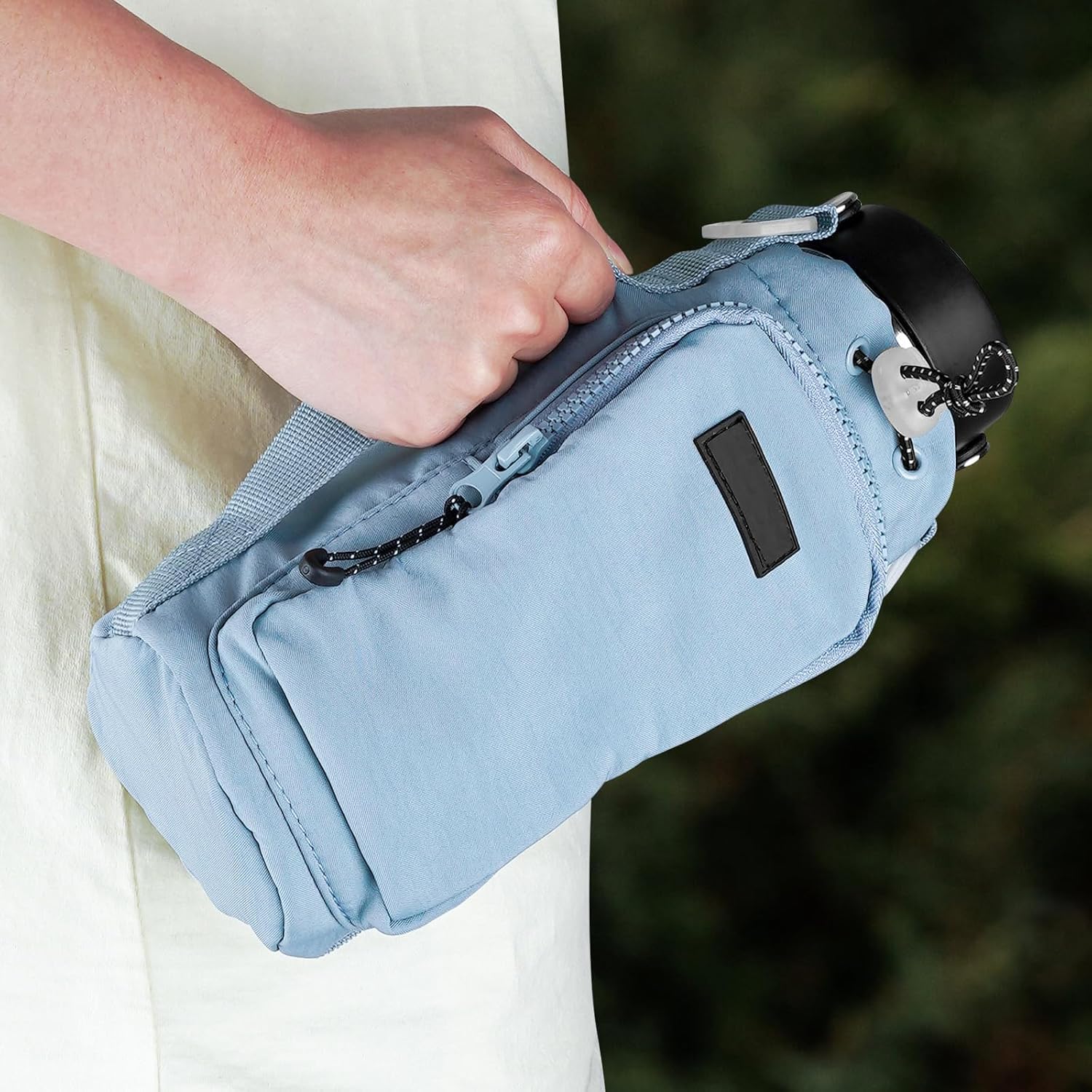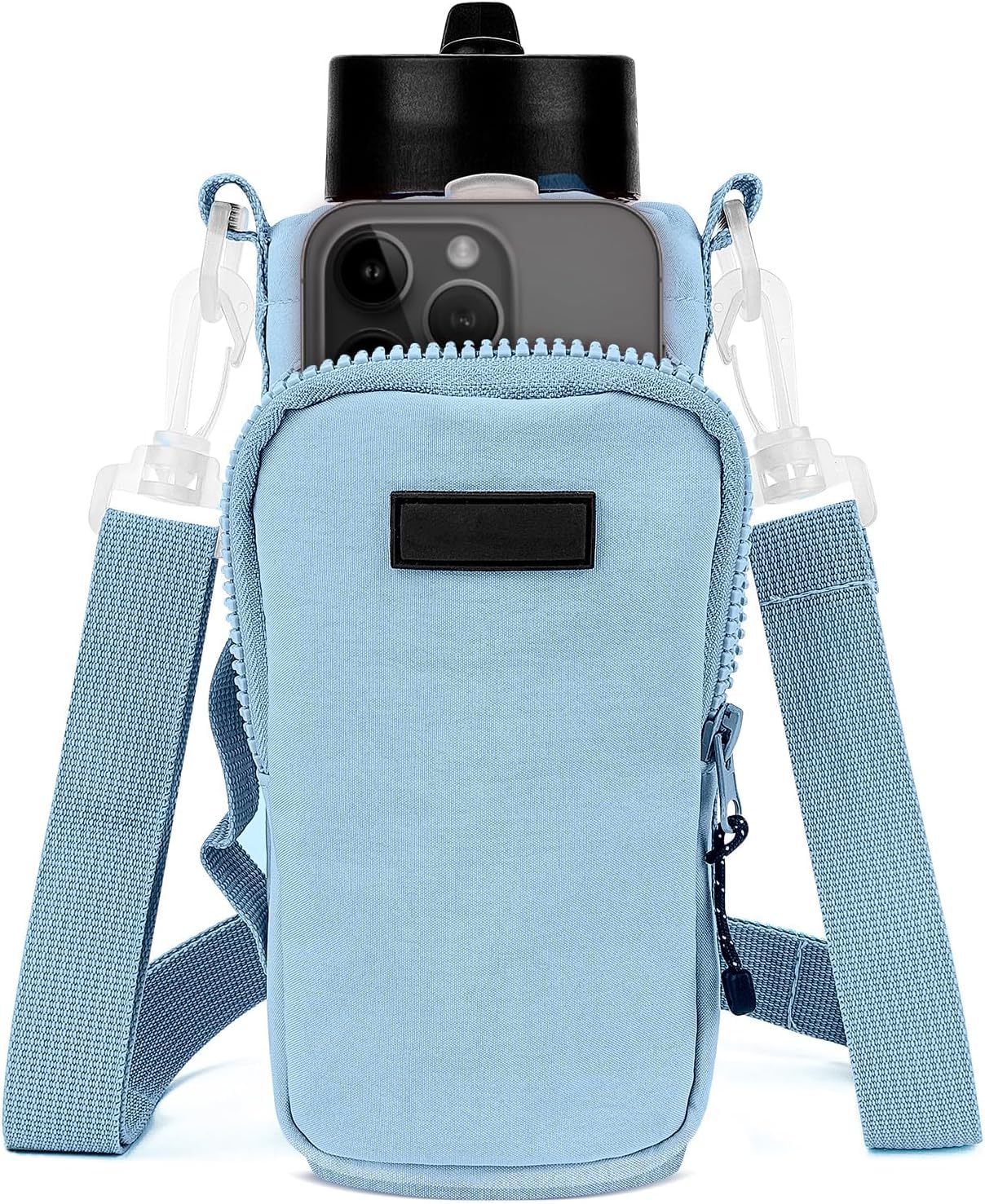Nylon Sports Water Bottle Holder with Shoulder Strap – Durable Insulated Bottle Carrier for 32oz Bottles – Ideal for Hiking and Sports with Multifunctional Front Pocket (Blue)