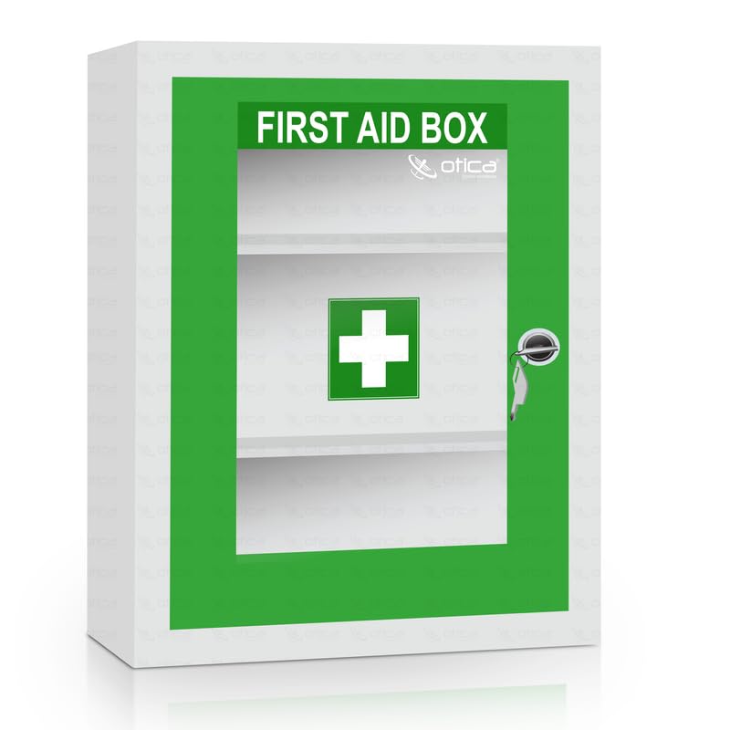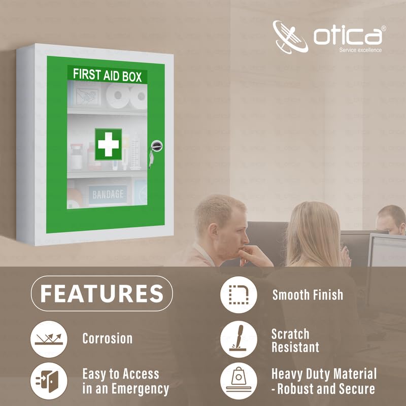 OTICA first aid kit box made from GI metal with red & ivory 7-layer powder coating which is rust proof, scratch-proof & corrosion free for long life.
