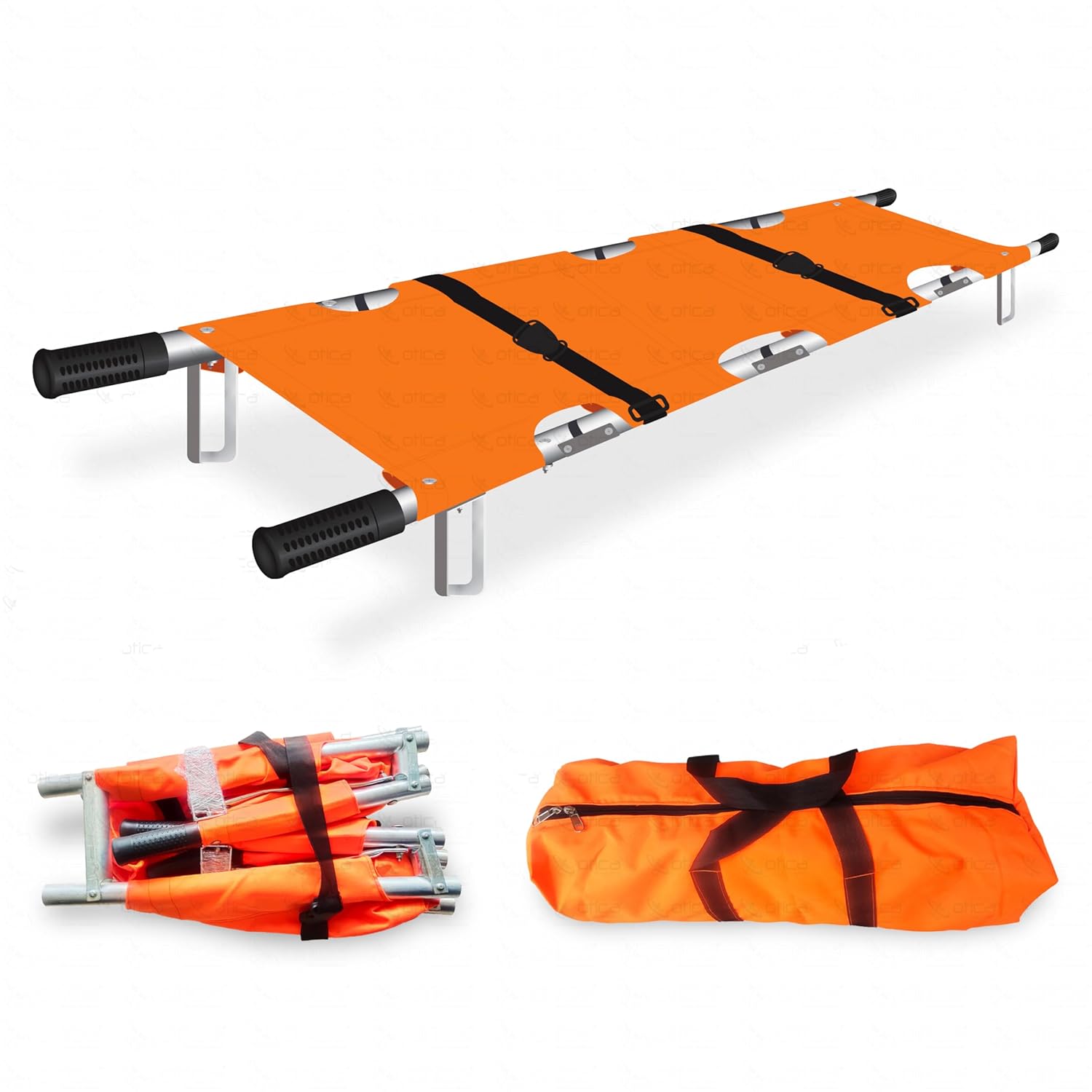 OTICA Foldable Stretcher for Patient Shifting, Portable Stretcher for Emergency Hospital Use, Stretcher for Patient with Safety Belt, Stretcher for Ambulance (Aluminium, Orange, Four Fold)