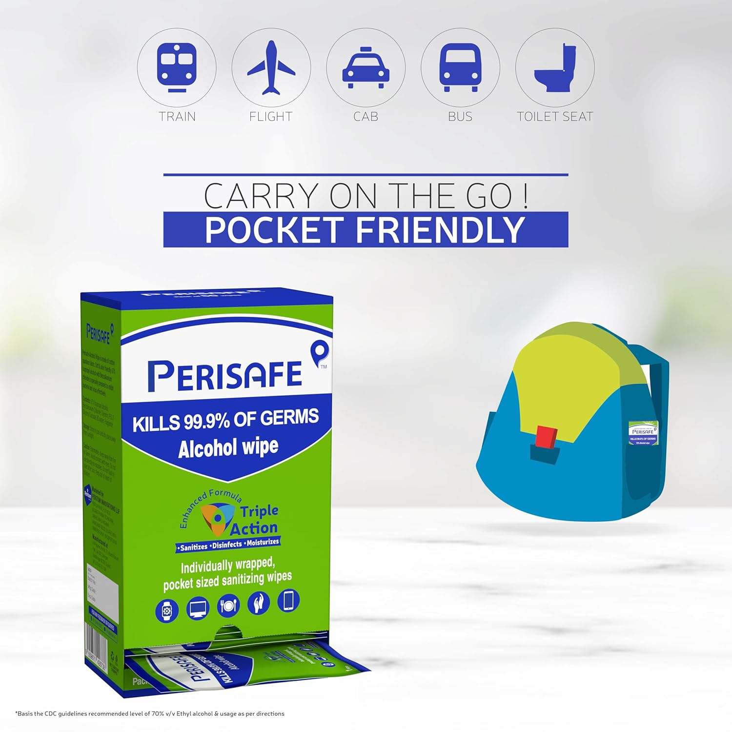 PERISAFE Pocket Sized Sanitizing Disinfectant Wipes Individually wrapped- Pack of 50 wipes