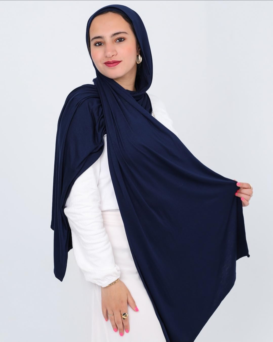 Elevate your modest fashion with this premium jersey hijab scarf featuring a coordinating black underscarf. Crafted from a luxuriously soft cotton blend material, this hijab offers exceptional comfort for all-day wear. The pristine white fabric drapes beautifully and provides excellent coverage while maintaining a lightweight feel. The jersey material offers the perfect balance of structure and fluidity, making it easy to style in various ways. The thoughtfully designed black underscarf ensures secure positioning and adds a polished finish to your look. The generous dimensions allow for versatile styling options, from classic wraps to contemporary arrangements. Perfect for daily wear, special occasions, or professional settings, this hijab maintains its elegant appearance throughout the day. The premium quality fabric resists wrinkling and stays in place, requiring minimal adjustment. Easy to care for and maintain, this hijab scarf is a versatile addition to any modest wardrobe.