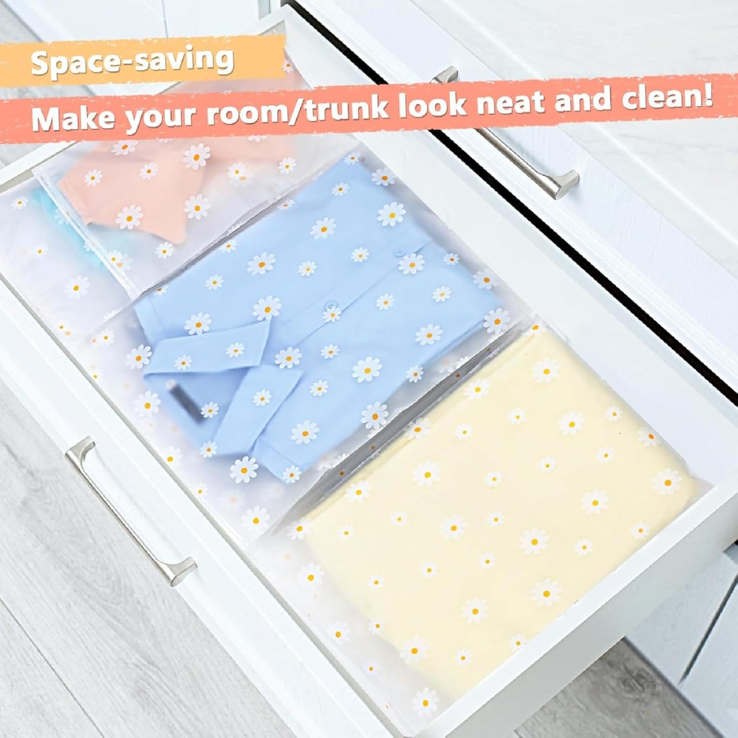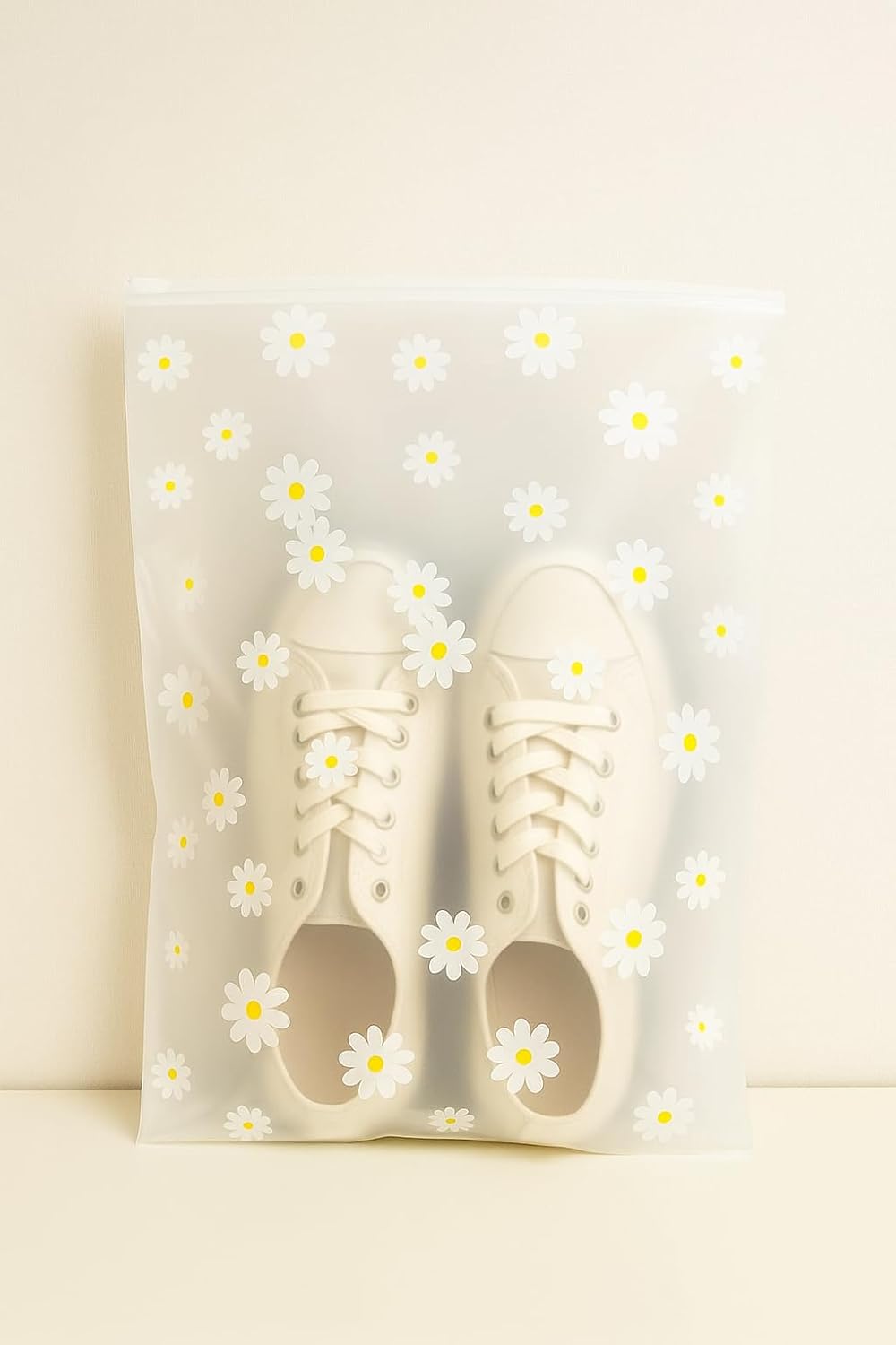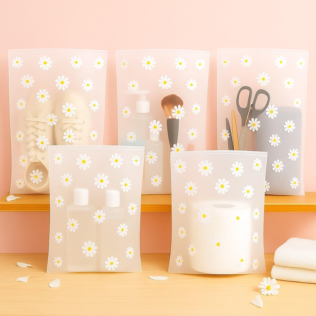 PulGos Pack of 5 Multipurpose Storage Bags – Frosted Semi-Transparent Travel Pouches with Daisy Print | Reusable Zip Bags for Toiletries, Makeup, Shoes & Gifting | Travel Packing Cubes