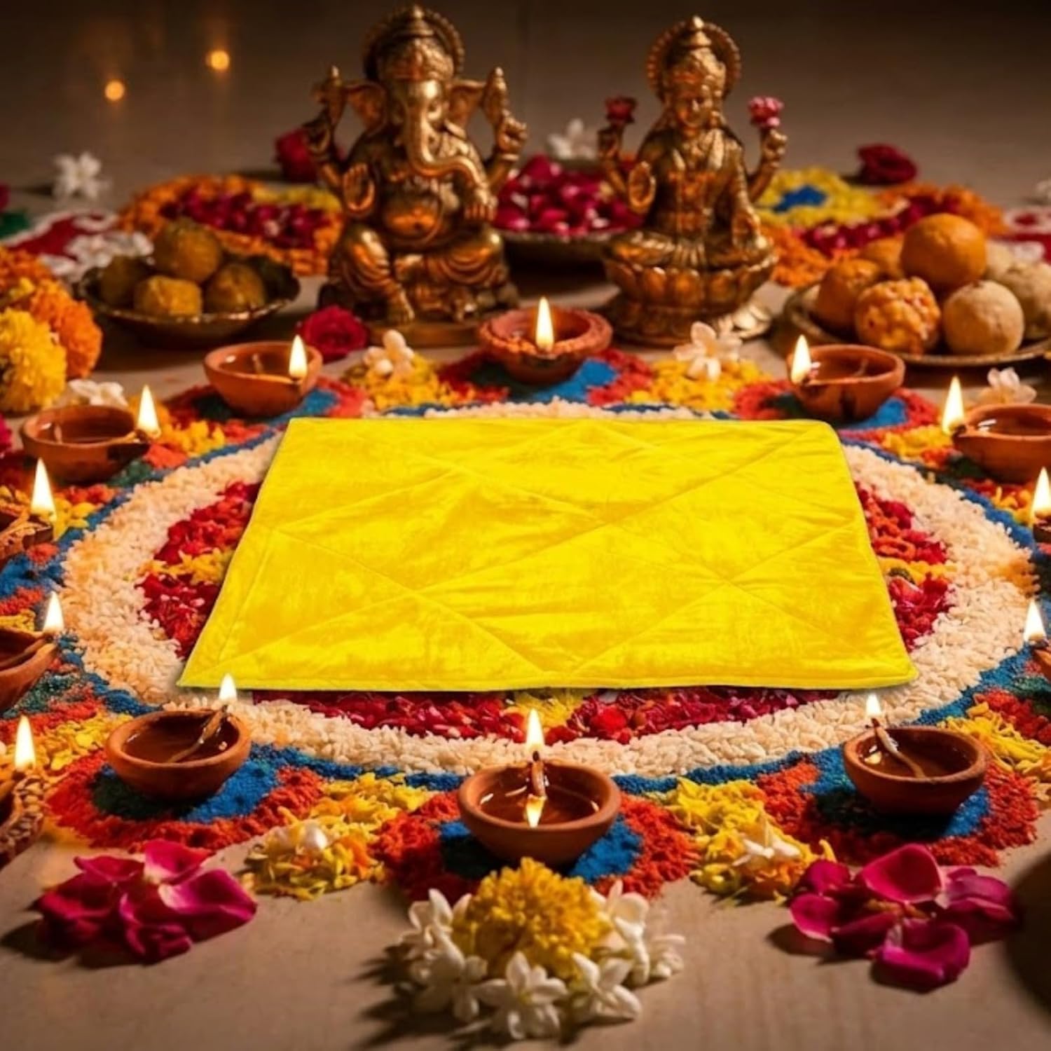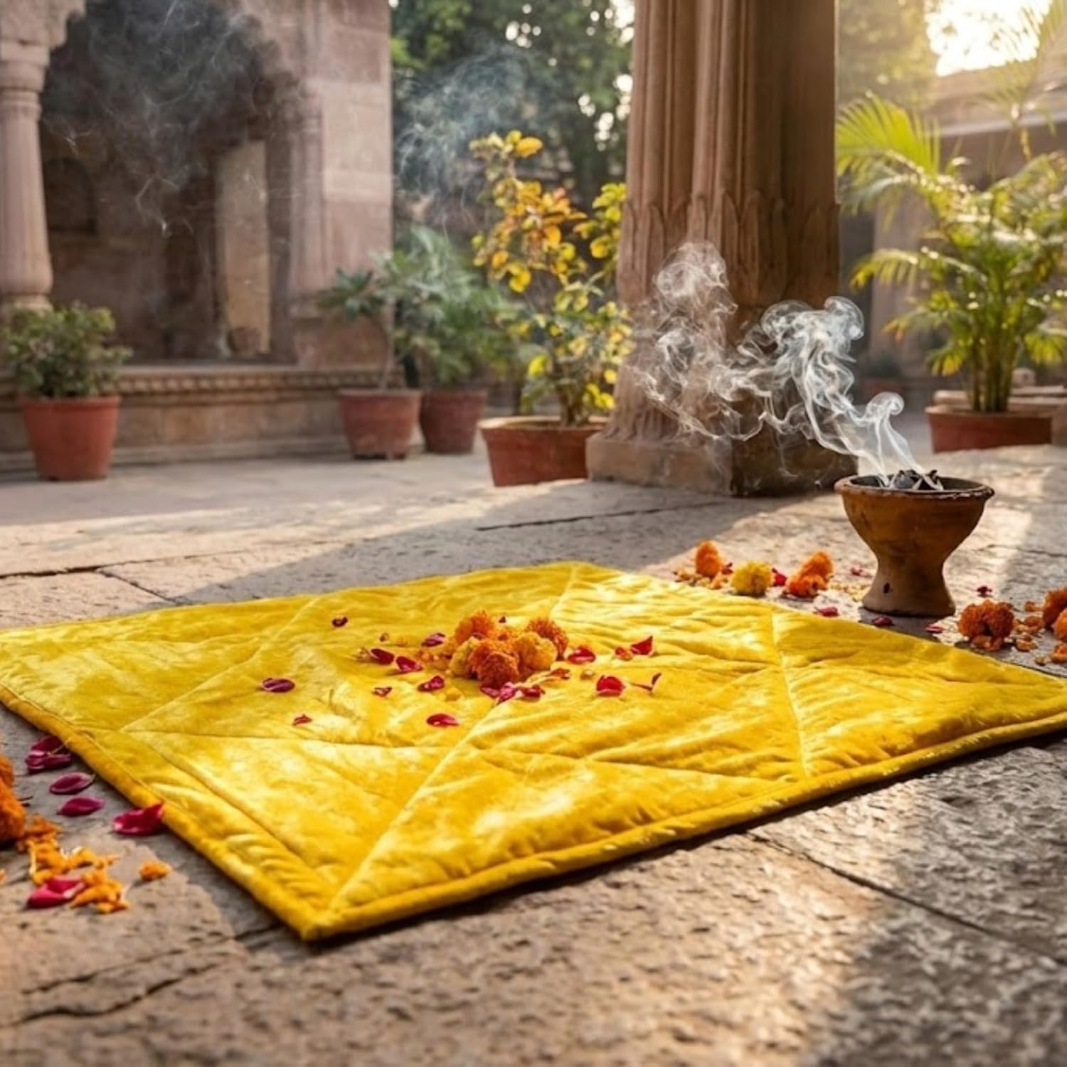 Pure Pooja Aasan Mat Puja Asan for Sitting Pooja Prayer Mat Velvet/Puja Mat/Meditation/Multipurpose Rug/Best in Quality (20X20) Handstitched RED/Yellow/Orange Colour (Yellow, Medium)