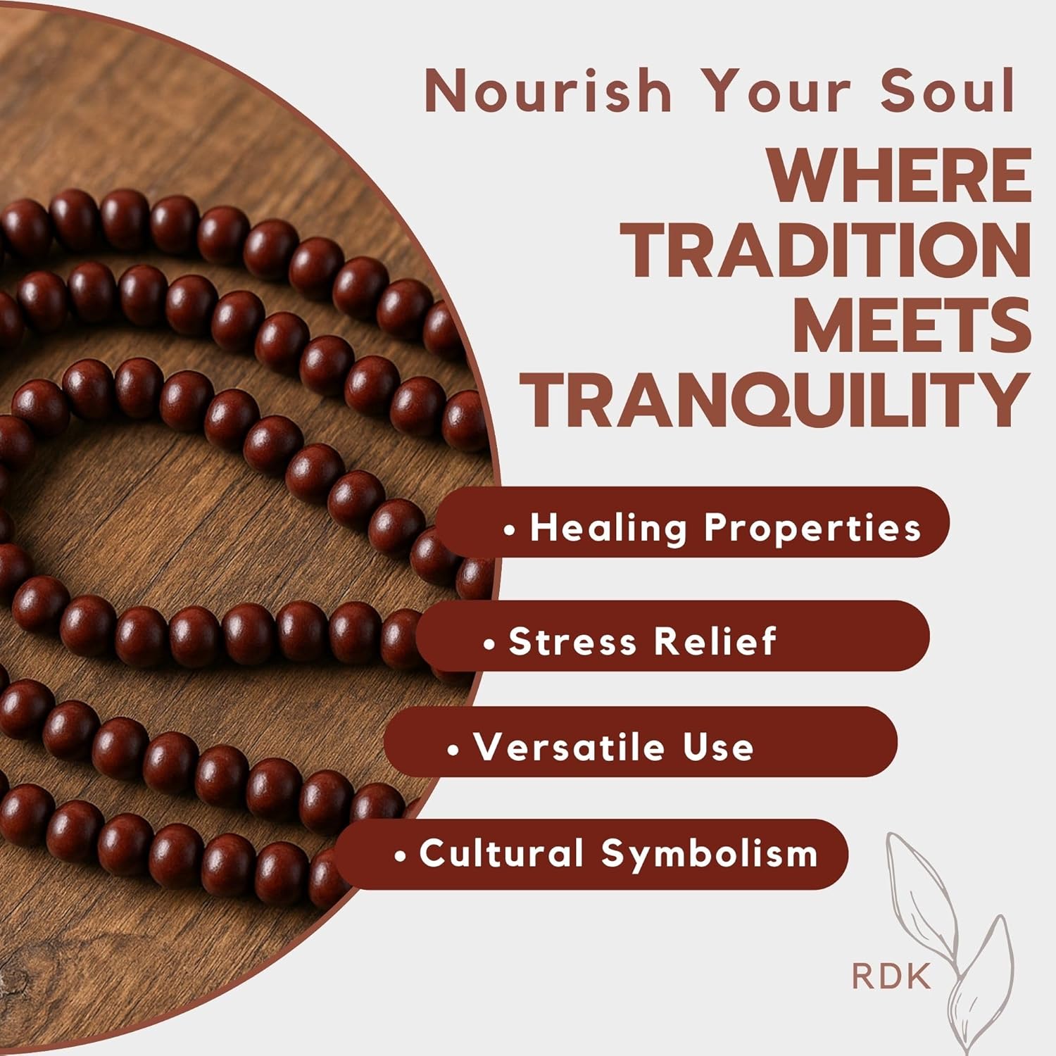 EACH BEAD CONNECTS WITH YOU IN A DIFFERENT WAY AND CAN HELP SYMBOLIZE DIFFERENT NEEDS AND TRAITS YOU WISH TO CULTIVATE IN YOUR DAILY LIFE. OUR BEADS ARE MADE FROM GENUINE SANDALWOOD THAT FEELS SMOOTH AND SOOTHING TO TOUCH AND REFLECTS LIGHT.