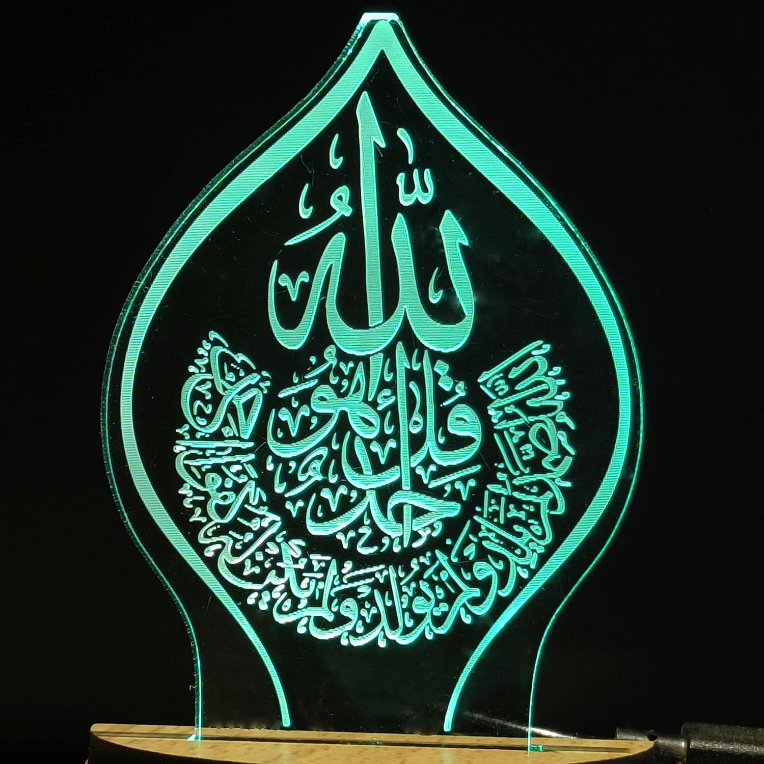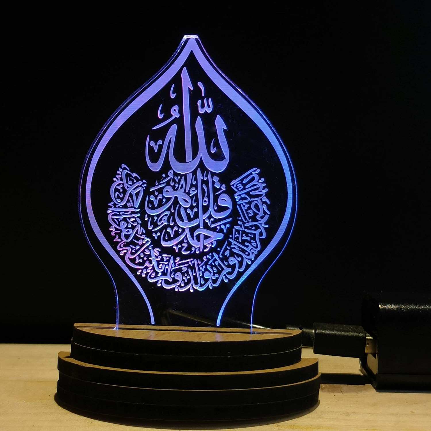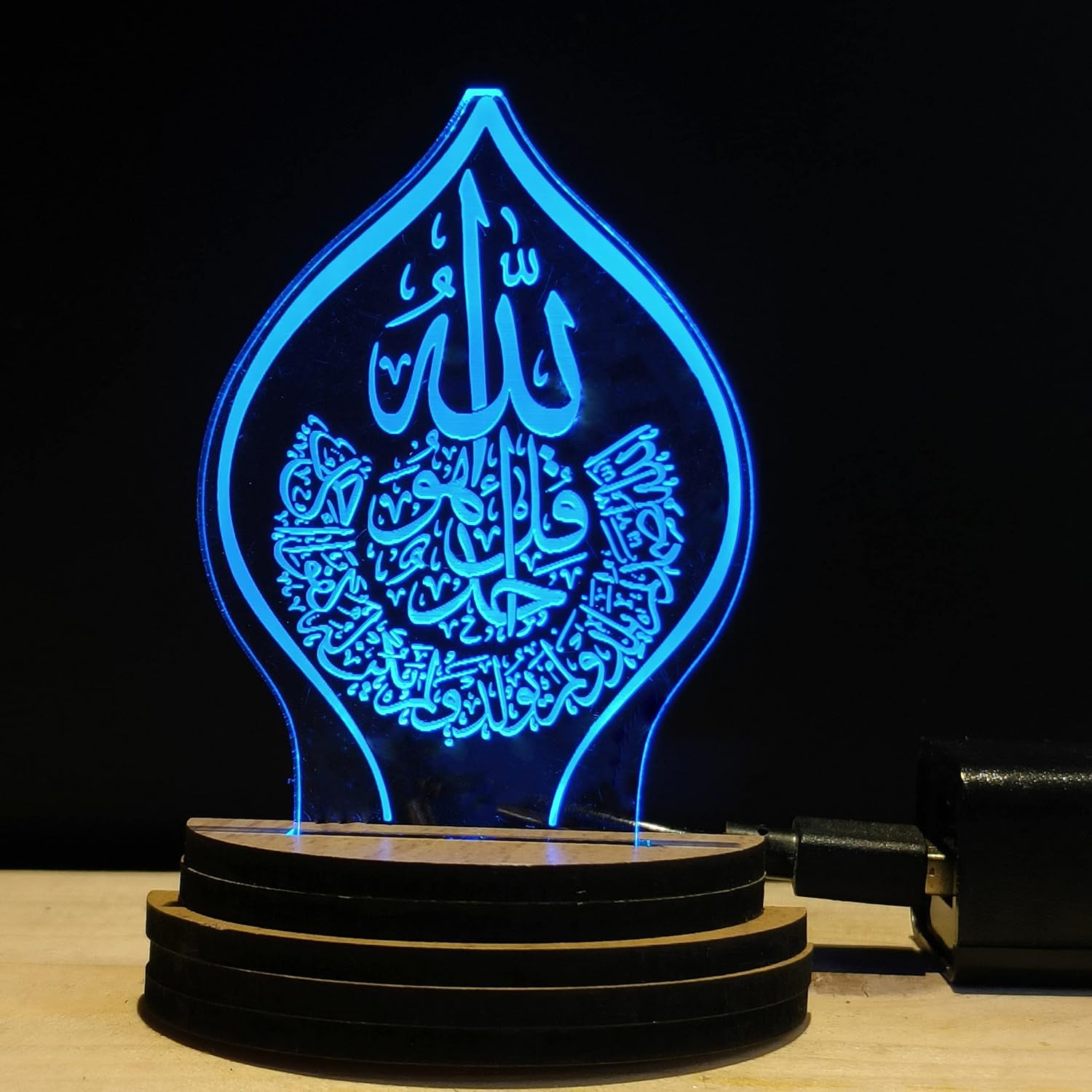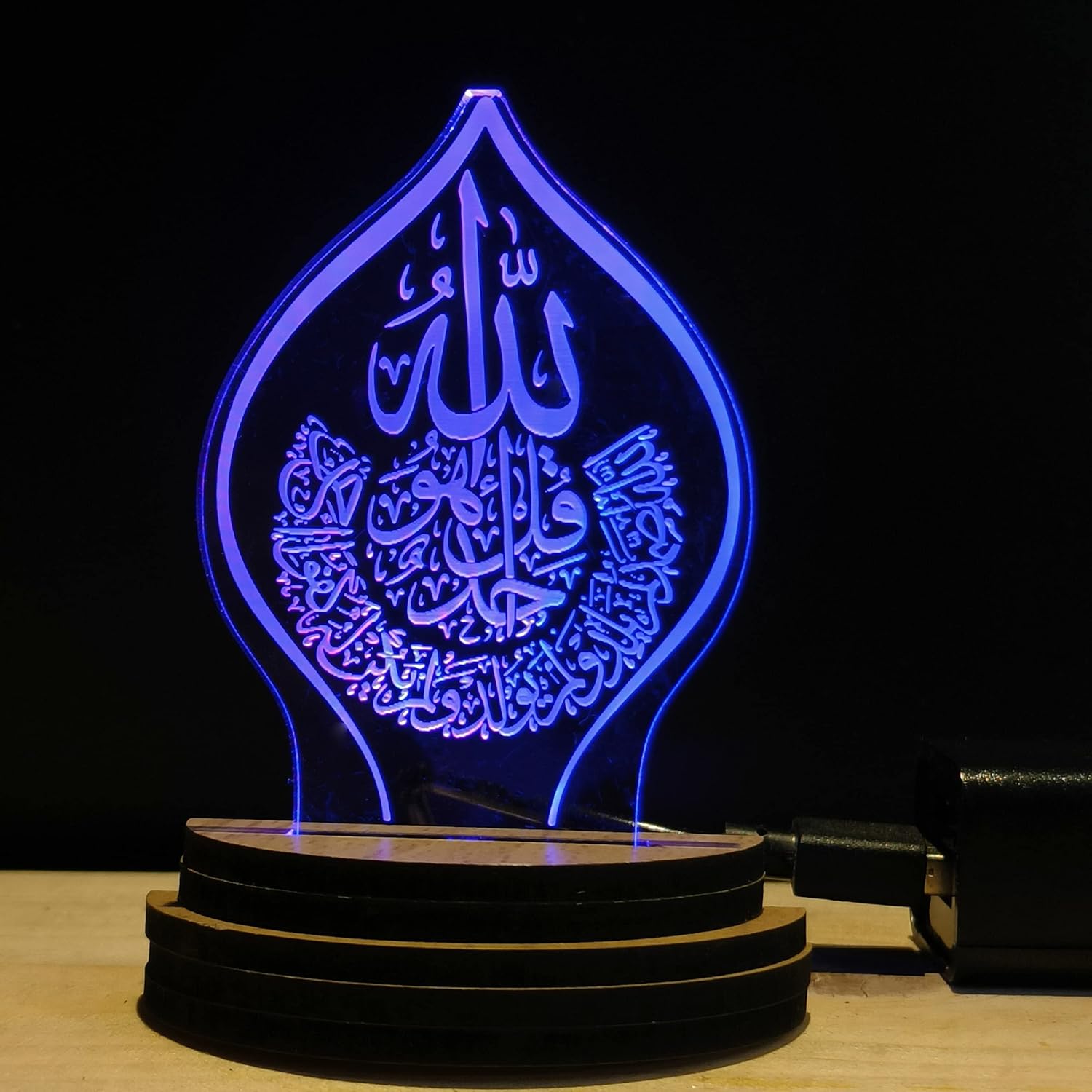 VISUALS and DESIGN: There is a 3D optical illusion occurring when you turn on this USB Powered Wooden Base night lamp. Laser engraved design will glow in RGB multicolor light. It gives pattern visuals in a dark atmosphere. This night lamp has a design of “ISLAMIC ALLAH” which makes it more glorious. When you turn on the night lamp you will see the “ISLAMIC ALLAH” design glows. Design Name : USB0147-ISLAMIC ALLAH