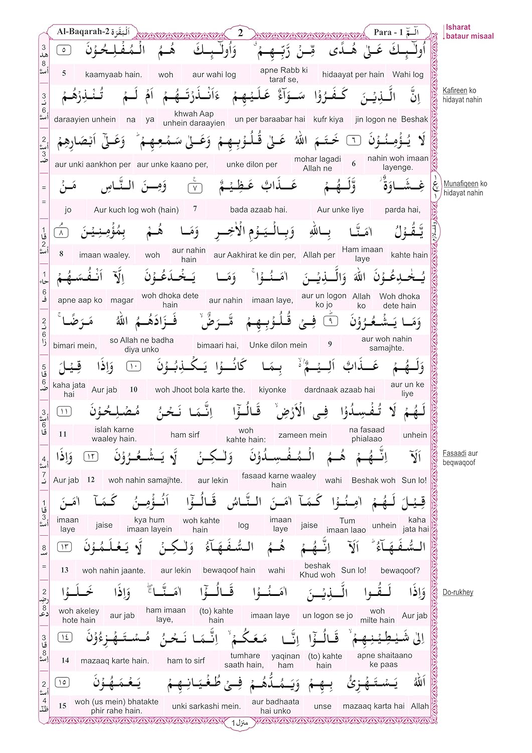 Unique features to help you understand the Qur’an * 15 lines per page (just like Hafizi / Madani Mushaf) * Easy Word-For-Word translation to facilitate the learning of Qur’anic Arabic * Running translation to understand the meaning of the Qur’an * Special Tajweed-coded font * Beautiful Bookmark with Tajweed rules & supplication for Sajdah of Tilawah