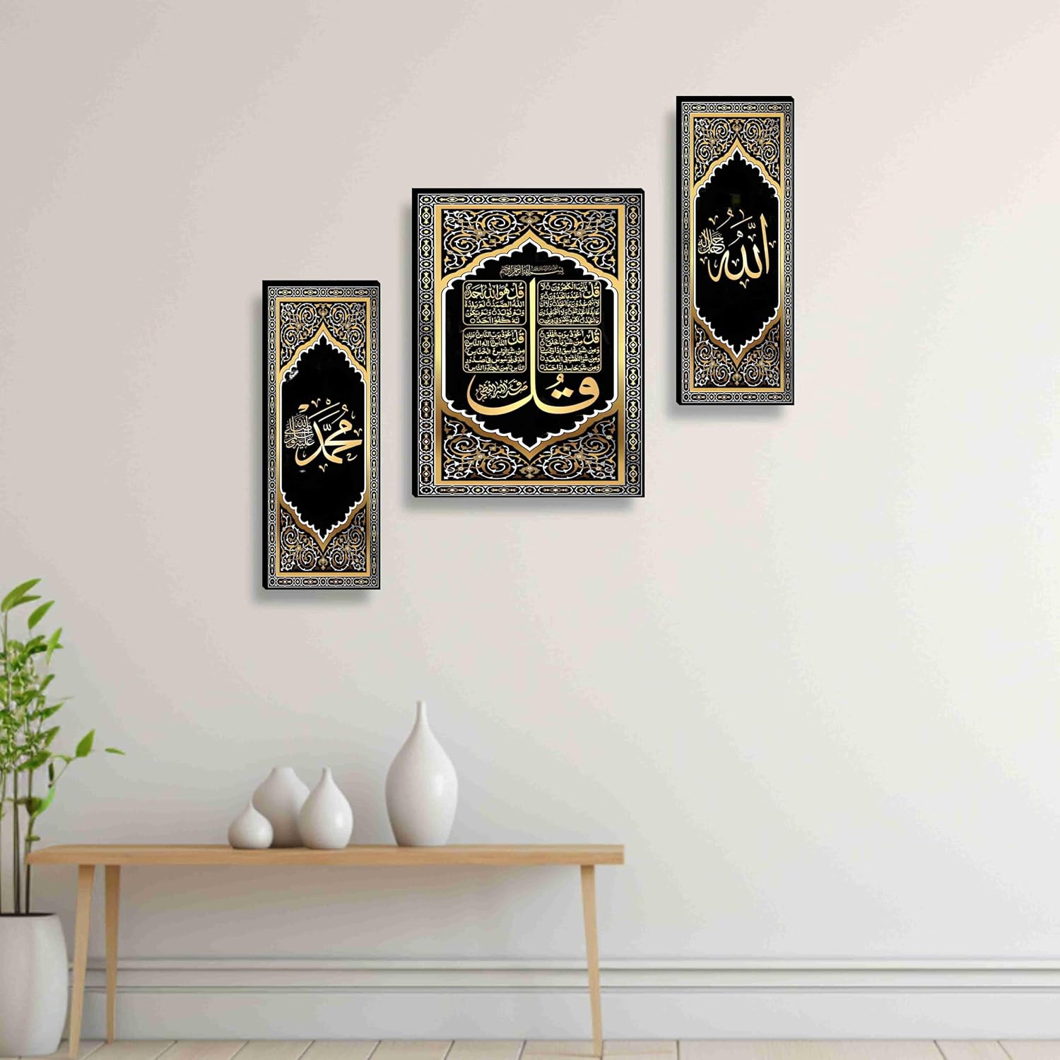 ✔ Set of 3 Islamic Panels – Features Allah, Muhammad, and Quranic calligraphy in ornate Arabic art style.