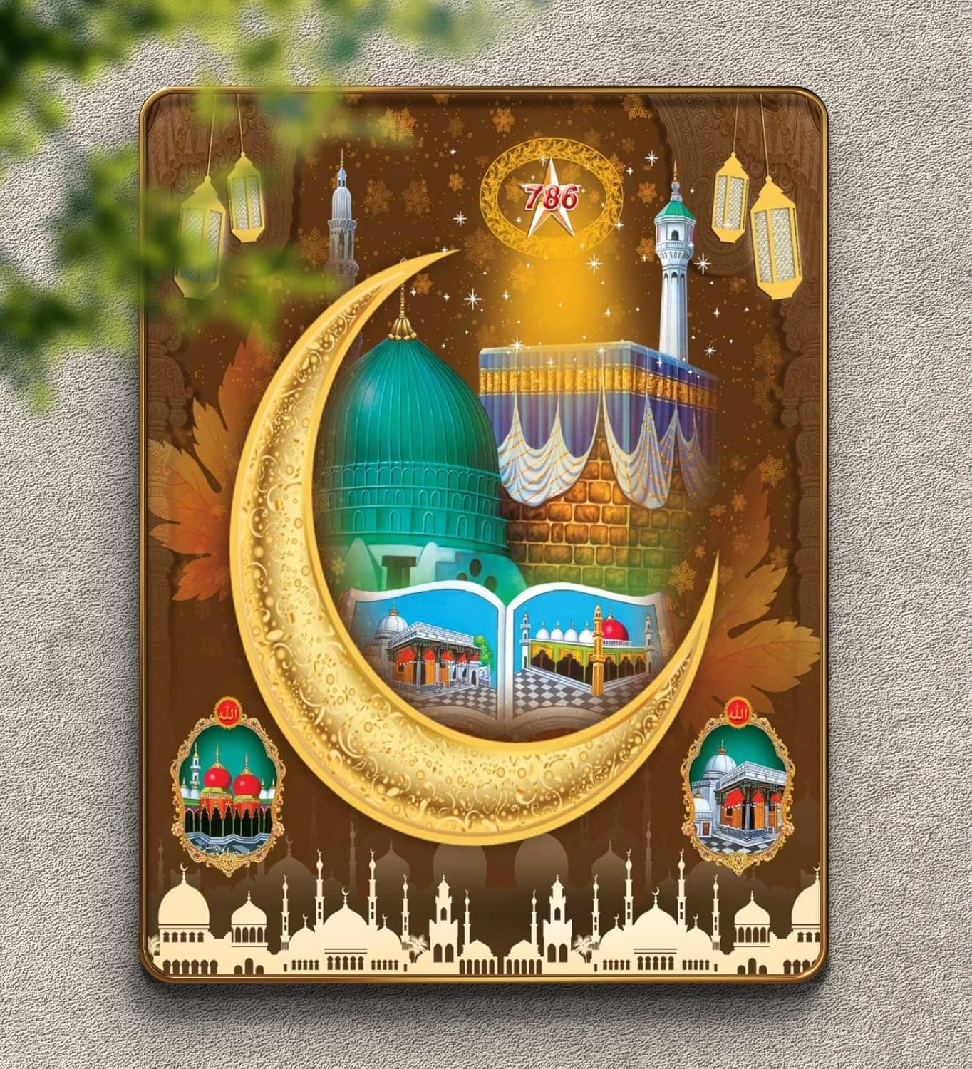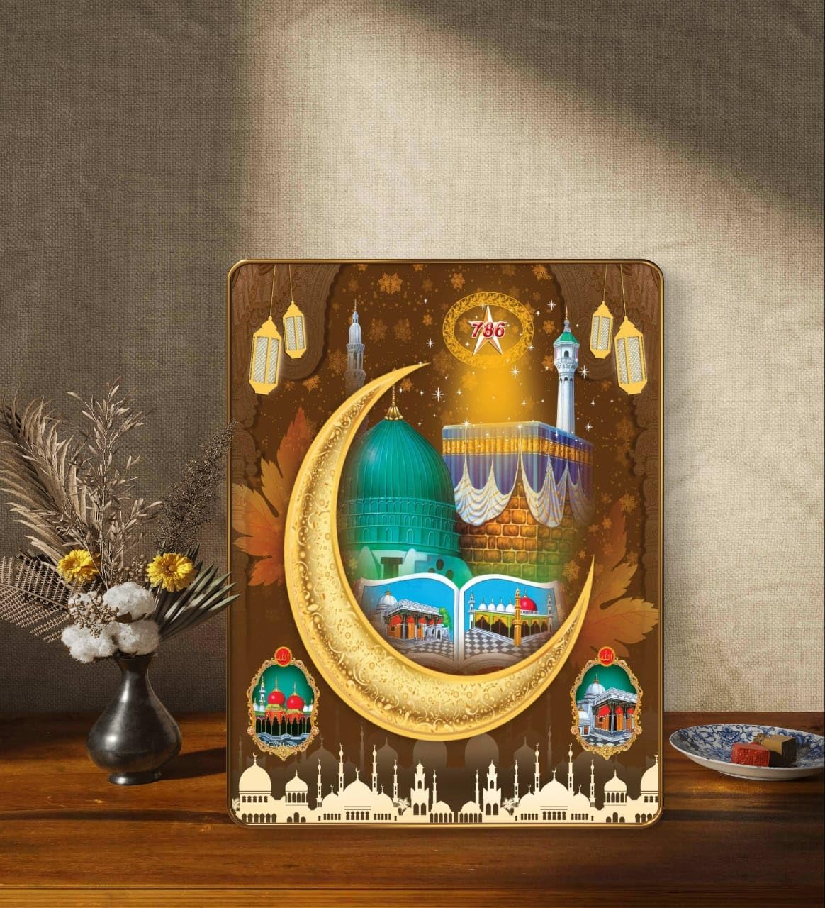Add a divine touch to your home with this beautifully designed Islamic wall painting featuring the Kaaba, Madina, and Crescent Moon. Printed on premium MDF board with a golden frame and sparkle lamination, it brings spiritual serenity to any prayer room or living space. Ideal for Ramadan, Eid, or as a thoughtful Islamic gift.