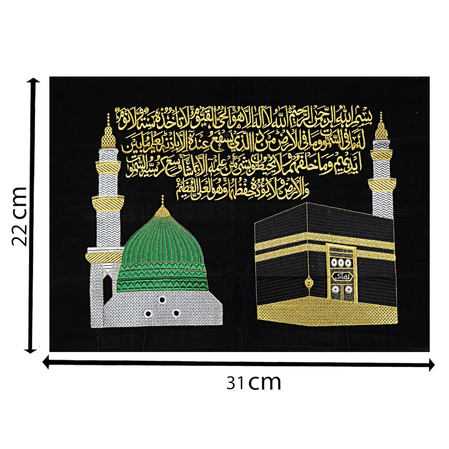 SAJJADAH ARTS Islamic Ayatul Kursi Wall Hanging Madina Kaaba Embroidery | Velvet Polyester Arabic Calligraphy Decorative Frame | 22 x 31 cm Spiritual Wall Art for Prayer Room Home Office Decor;SAEMB-H22xL31CM-0022