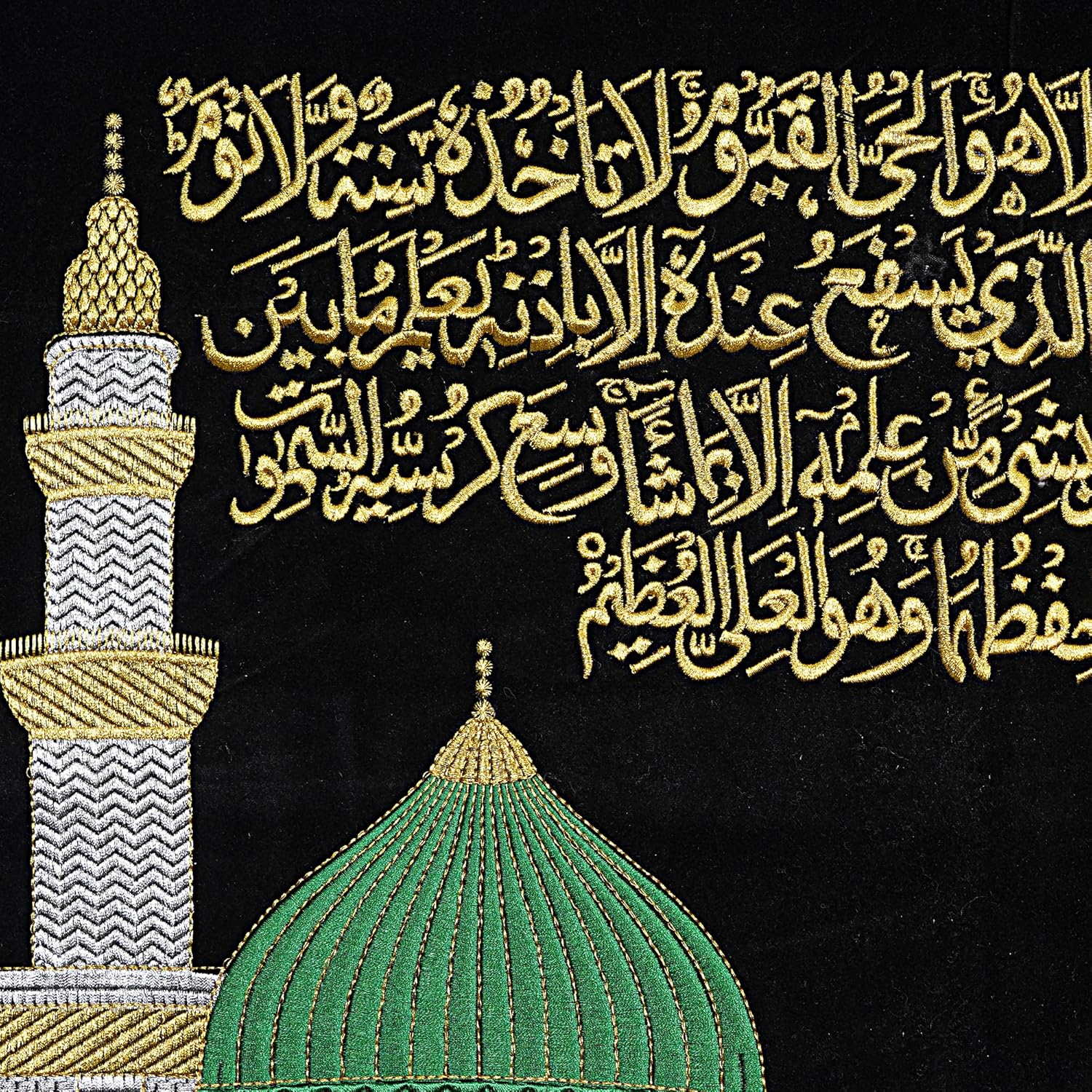 AYATUL KURSI CALLIGRAPHY – Features detailed Arabic Ayatul Kursi design combined with Madina dome and Kaaba inspired embroidery artwork