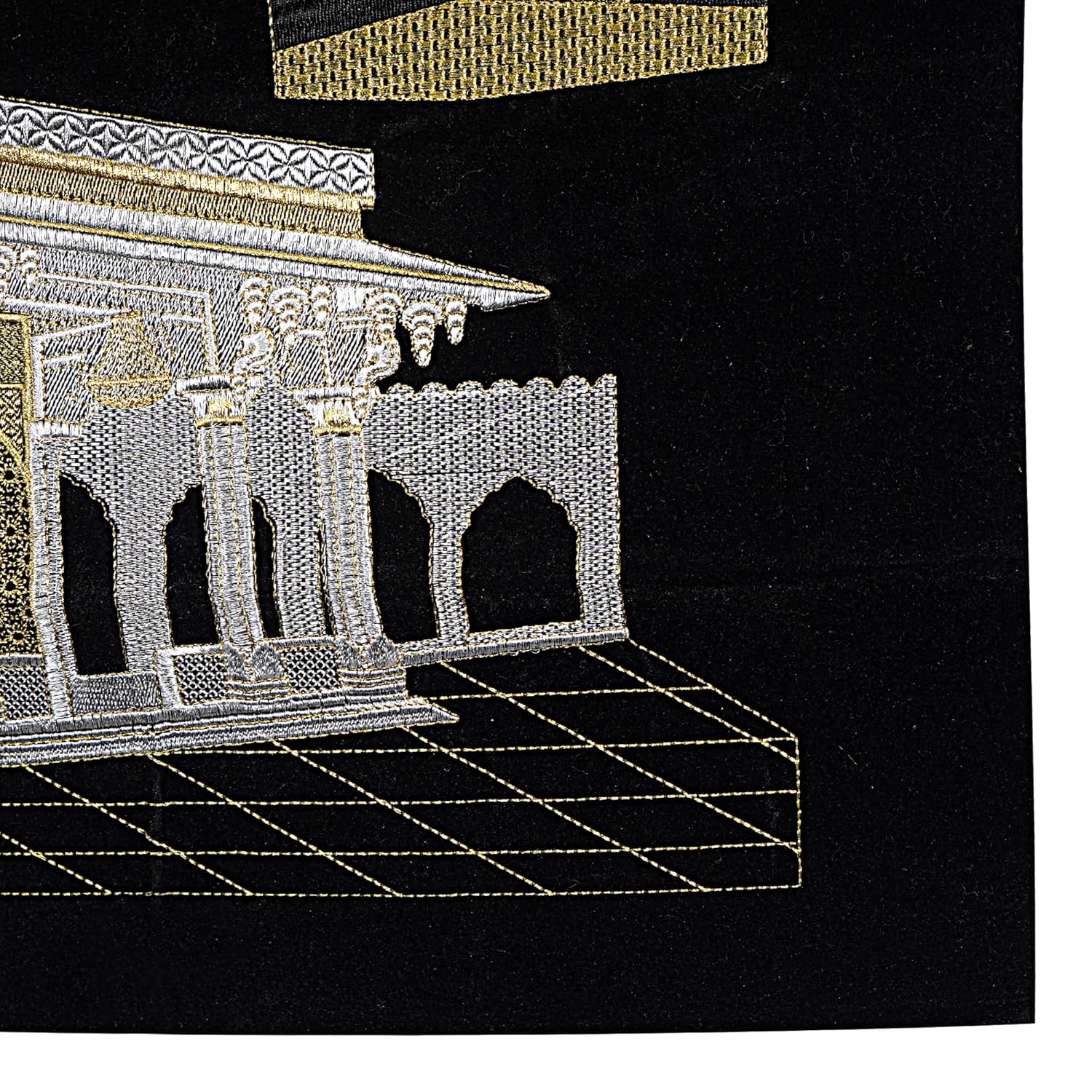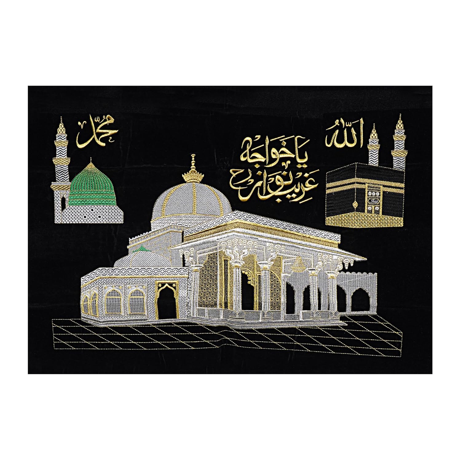DEVOTIONAL EMBROIDERY DESIGN – Features Ya Ghaus Azam calligraphy with Madina dome and Kaaba inspired shrine artwork for a spiritual decorative appearance